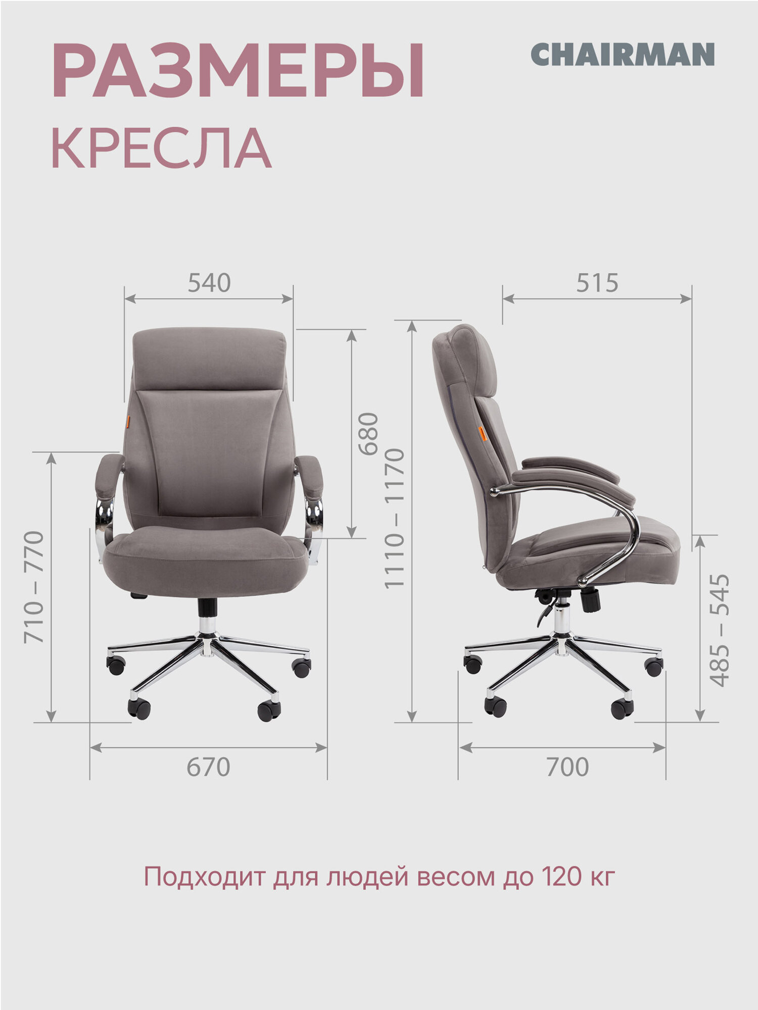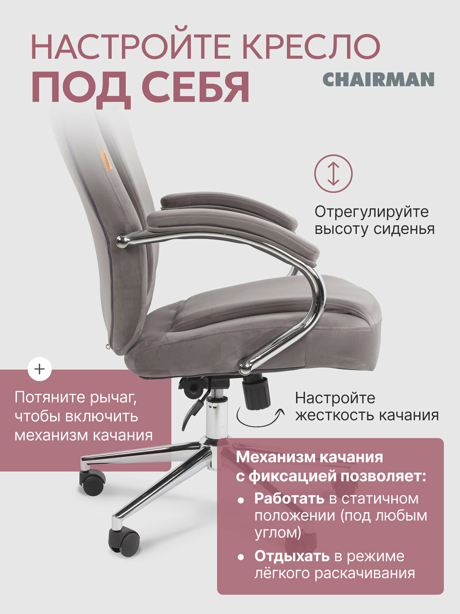 Компьютерное кресло для дома и офиса CHAIRMAN HOME 794, ткань велюр серый с хромированной крестовиной и подлокотниками