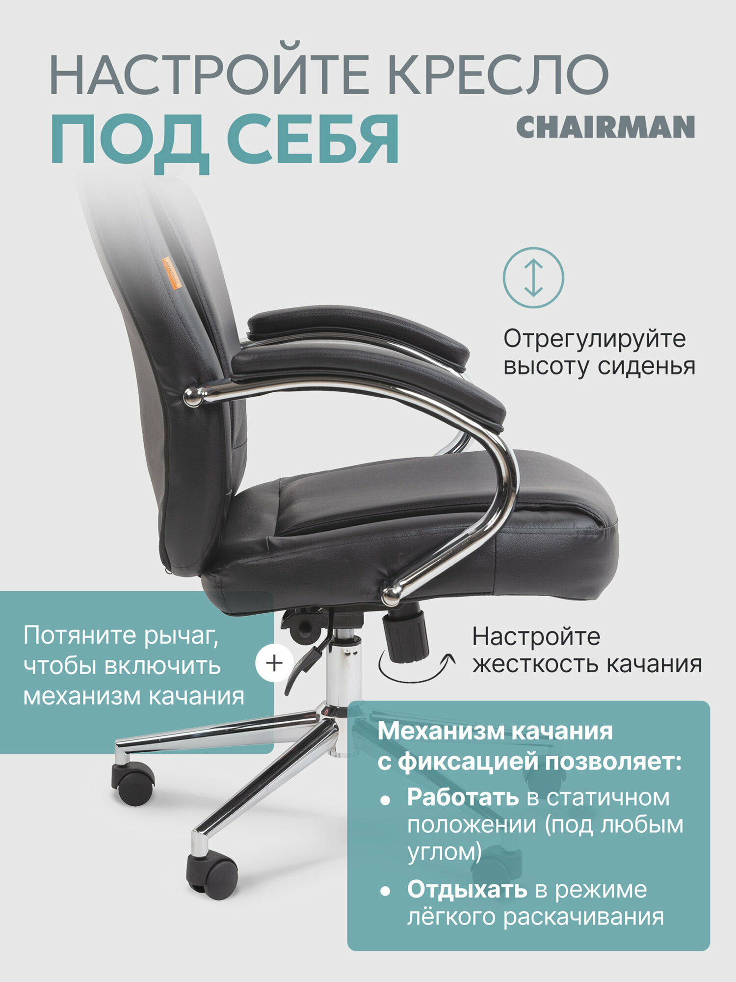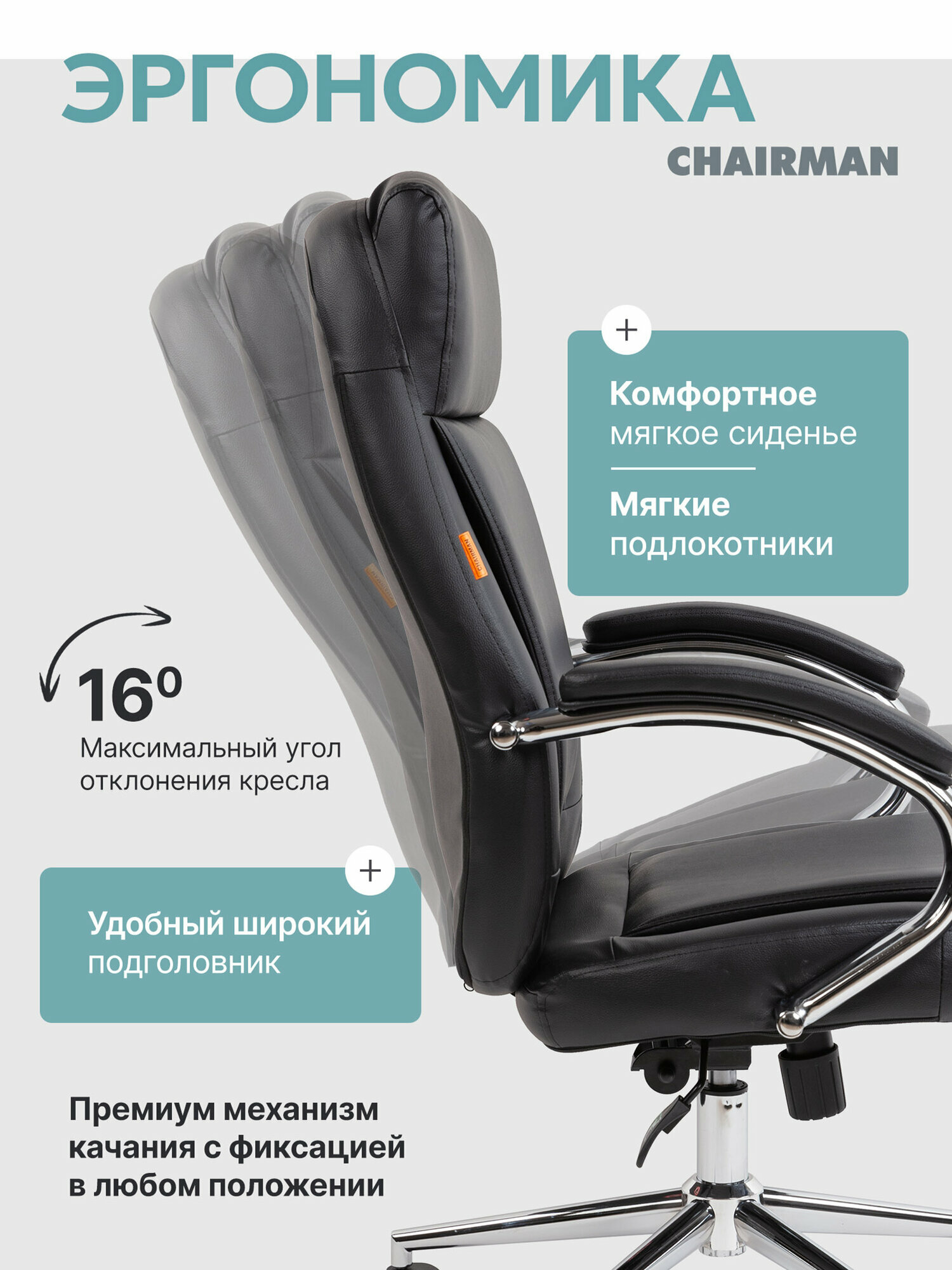 Компьютерное кресло руководителя CHAIRMAN 794 - это сочетание солидного дизайна, отличной эргономики и оптимального функционала. Традиционный дизайн кресла гармонично дополнен современными элементами, хромированными подлокотниками и крестовиной. Прямые линии и строгие формы делают модель статусной и респектабельной. Накладка на спинке не только добавляет креслу выразительности, но и обеспечивает комфорт при использовании, поддерживая правильную осанку. Компьютерное кресло CHAIRMAN 794 выполнено с учетом важных эргономических параметров. Высокая спинка с поясничной поддержкой обеспечивает правильное положение тела, помогая избежать перенапряжения в спине. Большой встроенный подголовник и подлокотники с мягкими накладками создают дополнительный комфорт. Регулировка высоты сиденья позволяет адаптировать офисное кресло под рост пользователя. Механизм качания с фиксацией кресла в любом положении - расслабиться и покачаться в перерывах. Угол отклонения спинки - 106 градусов. Обивка изготовлена из экокожи высокого качества, что обеспечивает удобство в использовании и долгий срок службы. Прочный металлический каркас и газлифт 3 класса выдерживают до 120 кг постоянной нагрузки. CHAIRMAN 794 - комфортное и статусное кресло, достойное лидера.