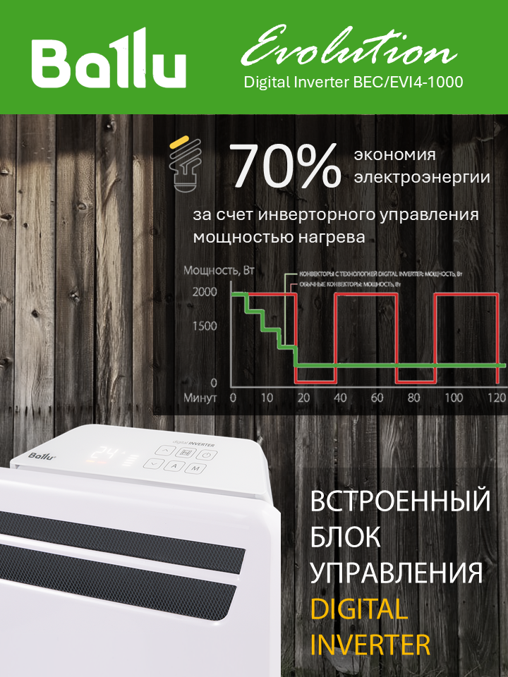 Ballu Evolution Digital Inverter – это сочетание передовых технологий, стильного дизайна и высокой надежности. Этот конвектор станет незаменимым помощником в поддержании комфортной атмосферы в вашем доме или офисе в холодное время года. Выберите Ballu Evolution Digital Inverter и наслаждайтесь теплом и уютом с минимальными затратами!