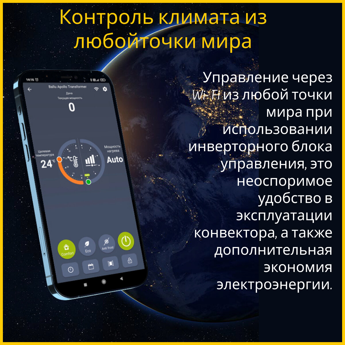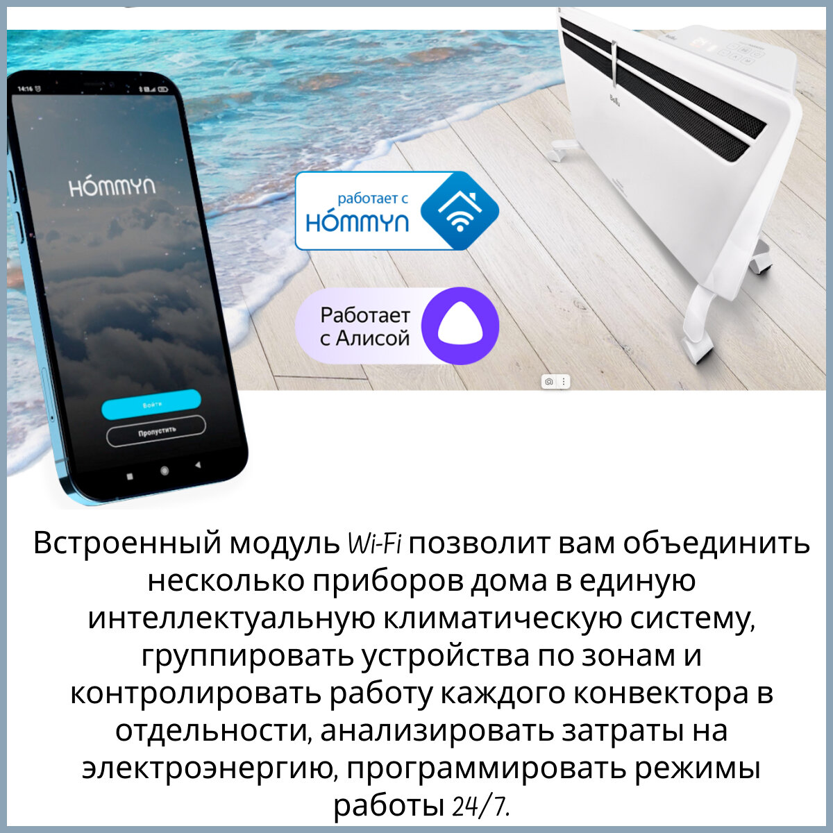 Этот конвектор сочетает в себе передовые технологии и стильный дизайн, легко вписываясь в любой интерьер. Благодаря встроенному Wi-Fi управлению, вы можете контролировать температуру в вашем доме из любой точки мира, используя свой смартфон или планшет. Забудьте о возвращении в холодный дом – заранее настройте комфортную температуру и наслаждайтесь уютом с первых минут.