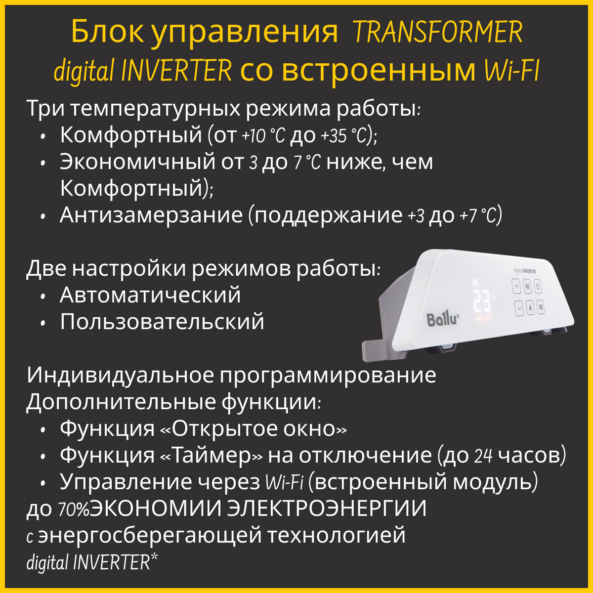 Выбирая электрический конвектор Ballu Evolution Transformer BECEVU-2000/4I C, вы получаете не только надежный источник тепла, но и современное устройство, которое сделает вашу жизнь комфортнее и проще. Наслаждайтесь уютом и теплом в вашем доме в любое время года!