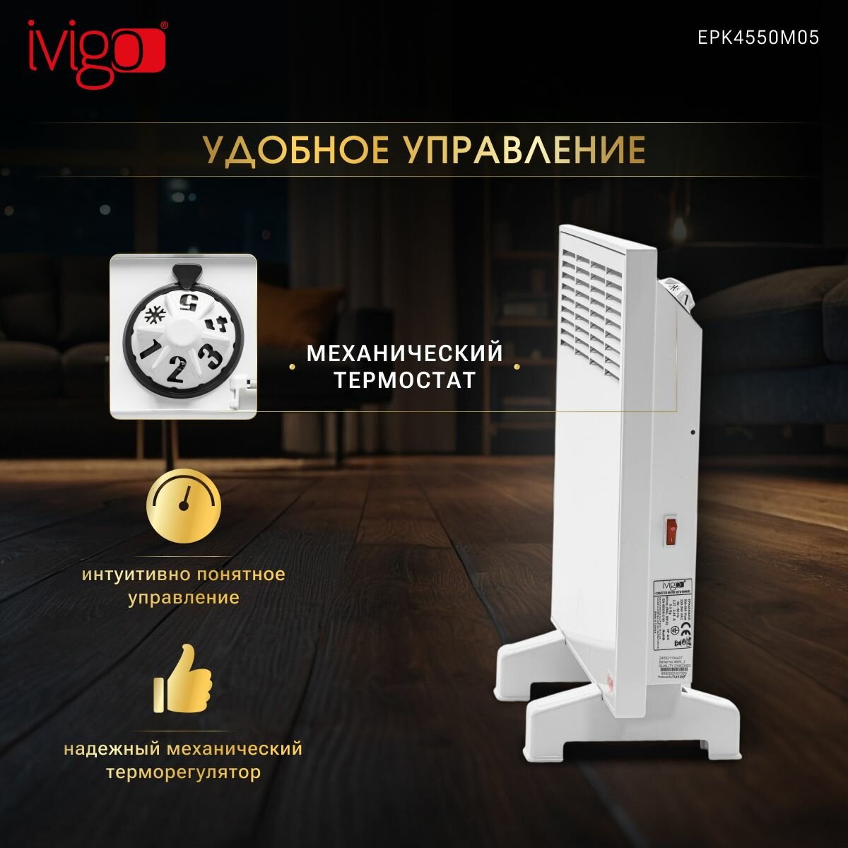 Электрический конвектор IVIGO EPK4550M05 – это надежный и экономичный способ обогрева, который обеспечит комфорт и уют в вашем доме в холодные дни. Приобретая этот конвектор, вы получаете эффективное решение для поддержания оптимальной температуры в помещении, которое прослужит вам долгие годы.