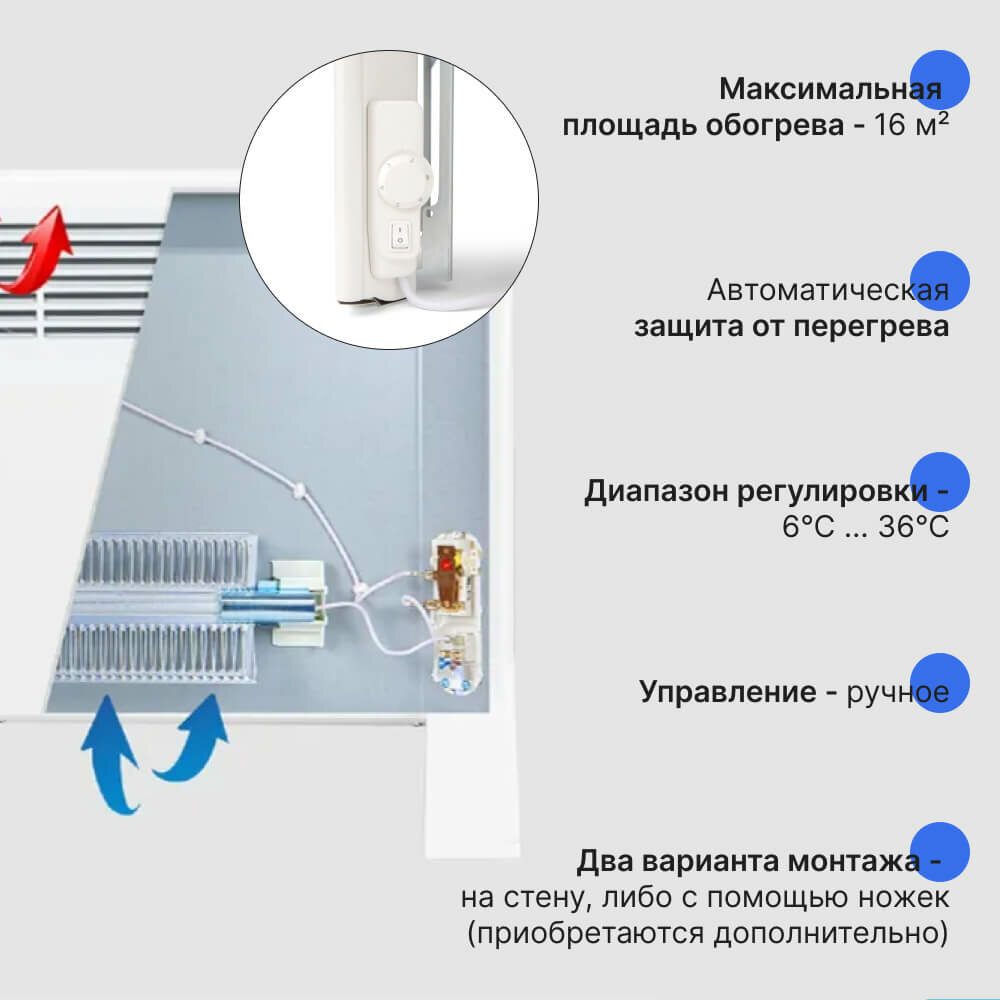 Этот конвектор отличается компактным дизайном и простотой установки. Он легко впишется в любой интерьер и не займет много места. Вы можете установить его на стену или использовать напольные ножки (приобретаются отдельно) для большей мобильности. Благодаря своей конструкции, конвектор обеспечивает равномерное распределение тепла по всему помещению, создавая уютную атмосферу.