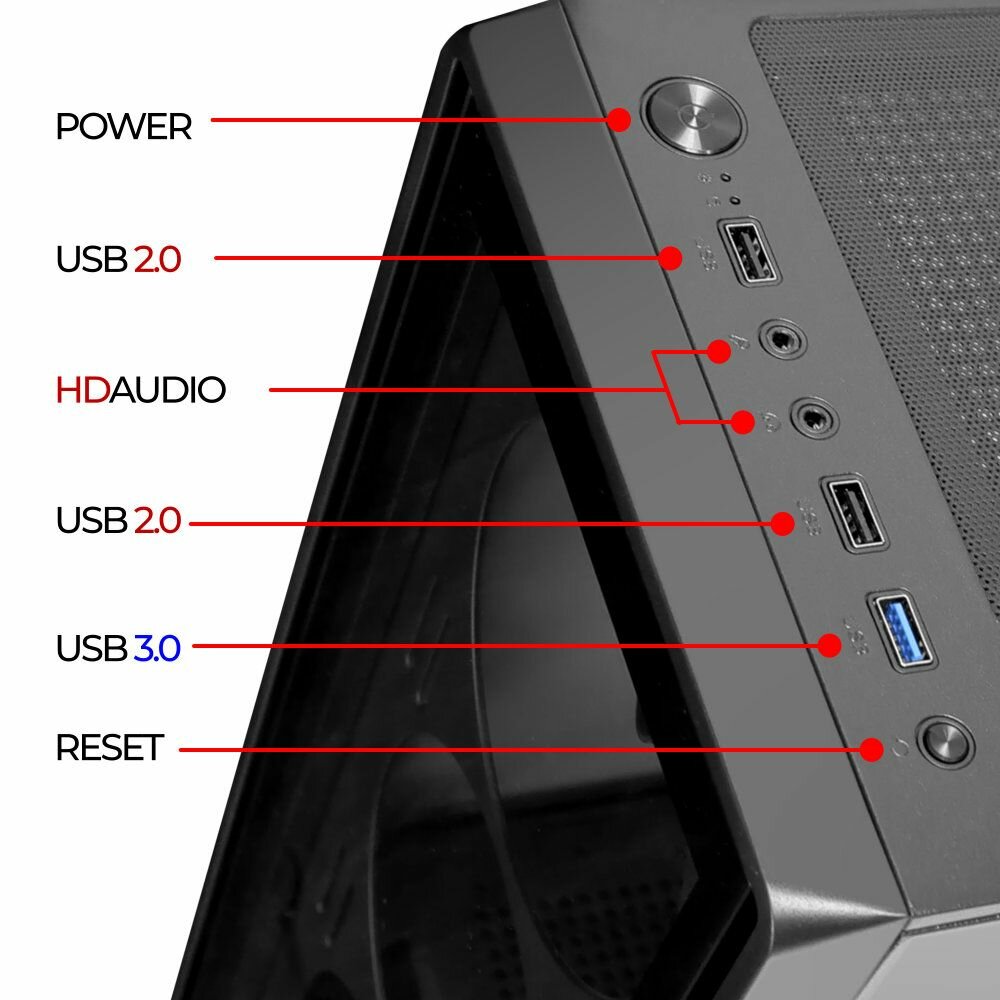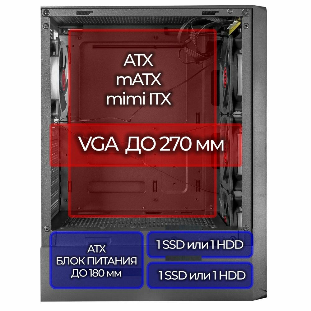 Продуманная конструкция корпуса обеспечивает эффективное охлаждение компонентов. Установка вентиляторов создает оптимальный воздушный поток, поддерживая стабильную работу даже при высоких нагрузках. ATX форм-фактор гарантирует совместимость с большинством современных материнских плат.