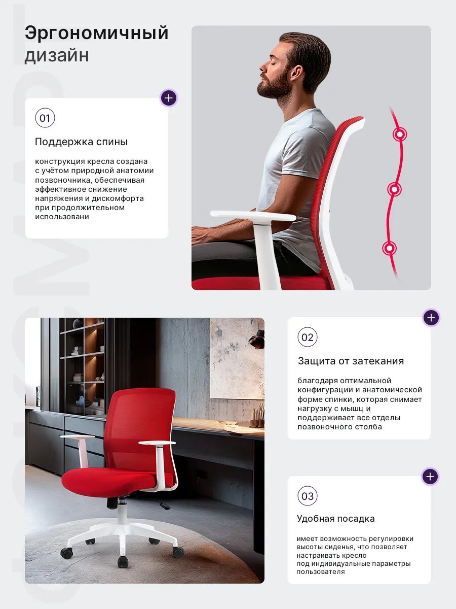 Это кресло разработано с учетом потребностей современных пользователей. Оно сочетает в себе современный дизайн и функциональность, позволяя вам чувствовать себя комфортно и уверенно в течение всего дня.