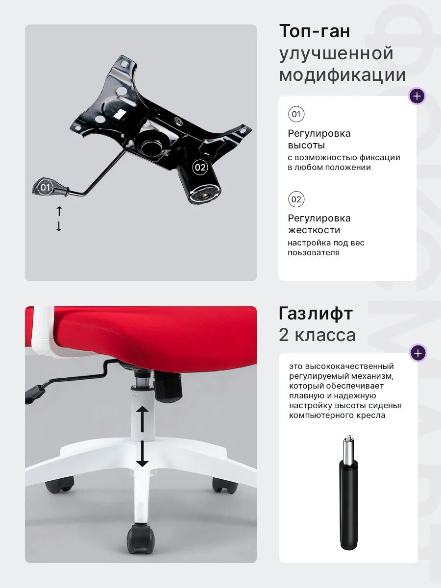 Благодаря продуманной конструкции и качественным материалам, кресло обеспечивает отличную поддержку спины и шеи, снижая усталость и напряжение. Регулируемые элементы позволяют настроить кресло под ваши индивидуальные потребности, обеспечивая максимальный комфорт и эргономику.