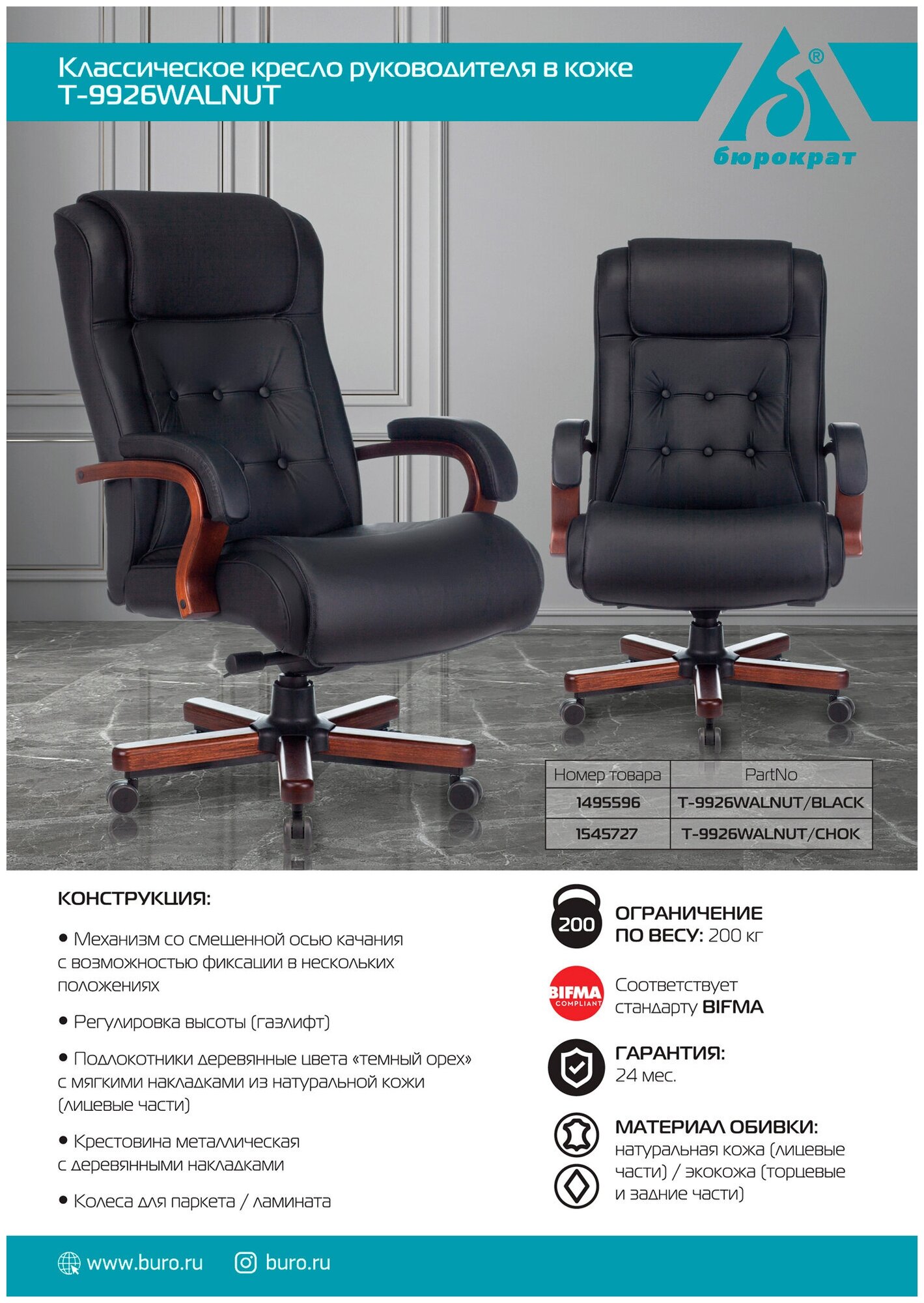 Кресло руководителя Бюрократ T-9926WALNUT, на колесиках, кожа, черный [t-9926walnut/black]