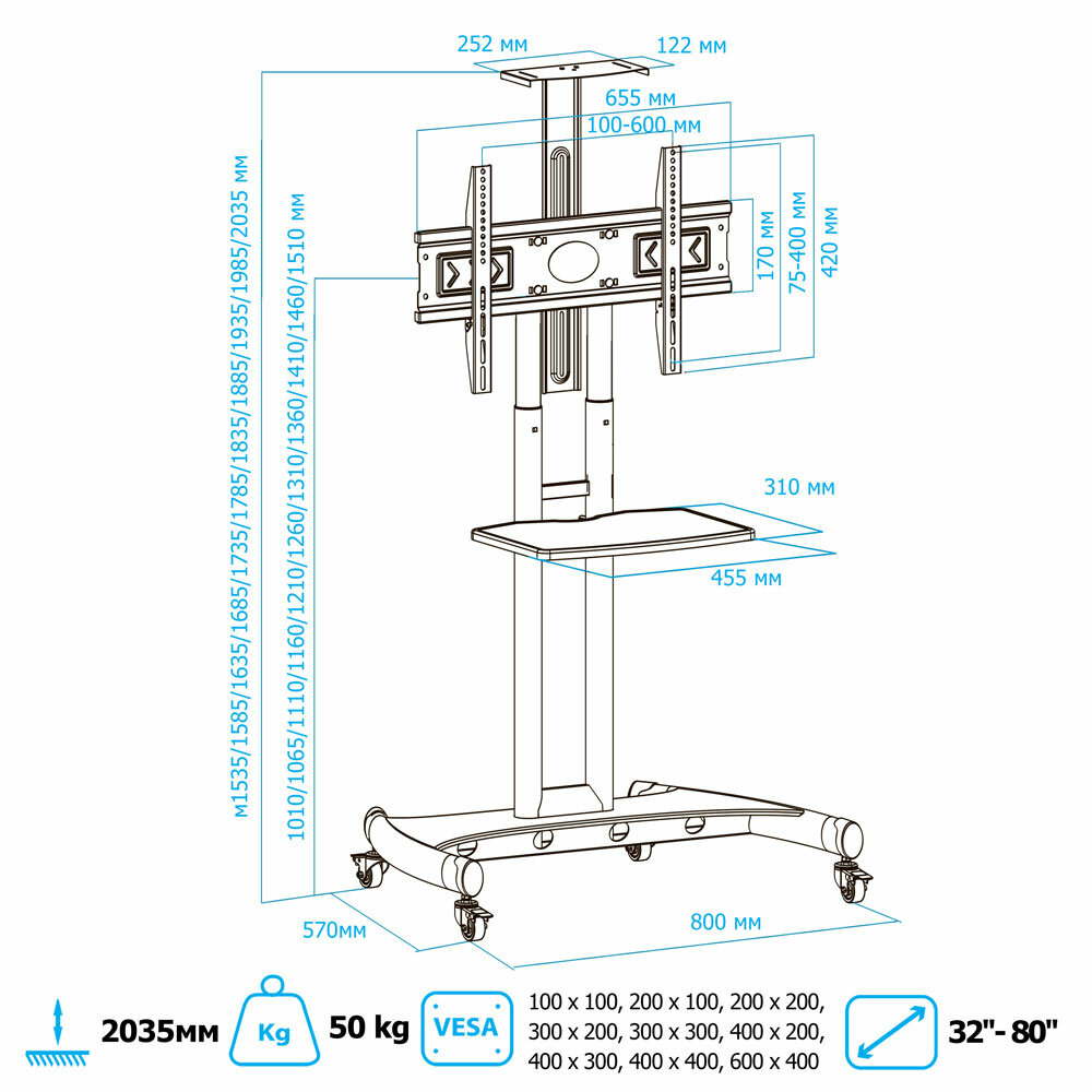 Ищете надежное и мобильное решение для размещения вашего телевизора? Представляем вам мобильную стойку KROMAX OMEGA-17 – идеальный выбор для дома, офиса или выставочного зала. Эта стойка разработана для телевизоров с диагональю от 32 до 80 дюймов и весом до 50 кг, обеспечивая безопасную и устойчивую поддержку.