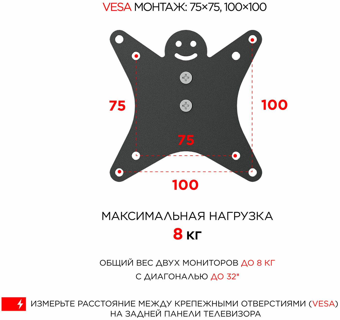 Универсальный дизайн этого кронштейна делает его совместимым с большинством современных мониторов. Простая и надежная конструкция обеспечивает безопасное и стабильное крепление вашего экрана. Вы сможете легко отрегулировать угол наклона и поворота монитора, чтобы добиться идеального положения для работы или развлечений.
