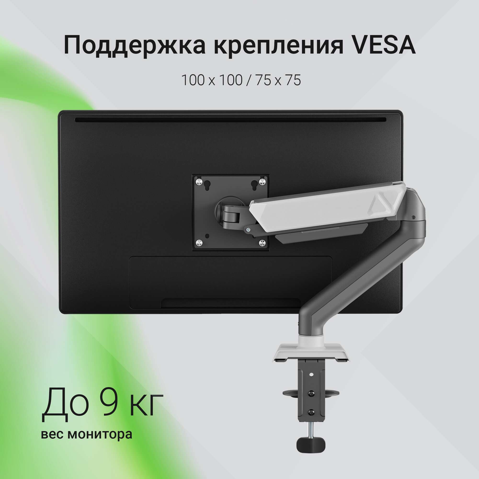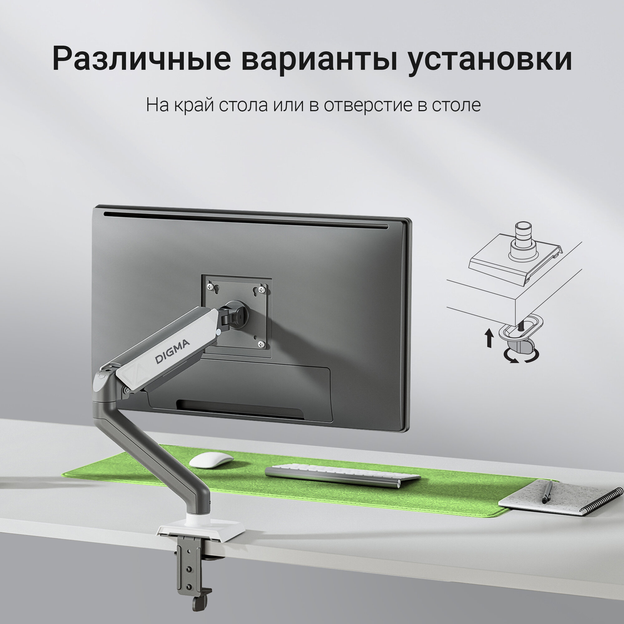 Этот кронштейн позволяет легко и быстро установить монитор на столешнице, освобождая место и создавая более организованную рабочую зону. Благодаря возможности поворота и наклона, вы сможете настроить оптимальный угол обзора для снижения нагрузки на глаза и шею.