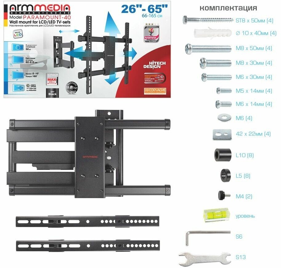 Выберите кронштейн ARM MEDIA Paramount 40 и наслаждайтесь комфортным просмотром любимых фильмов и передач! Это надежное и функциональное решение, которое прослужит вам долгие годы.