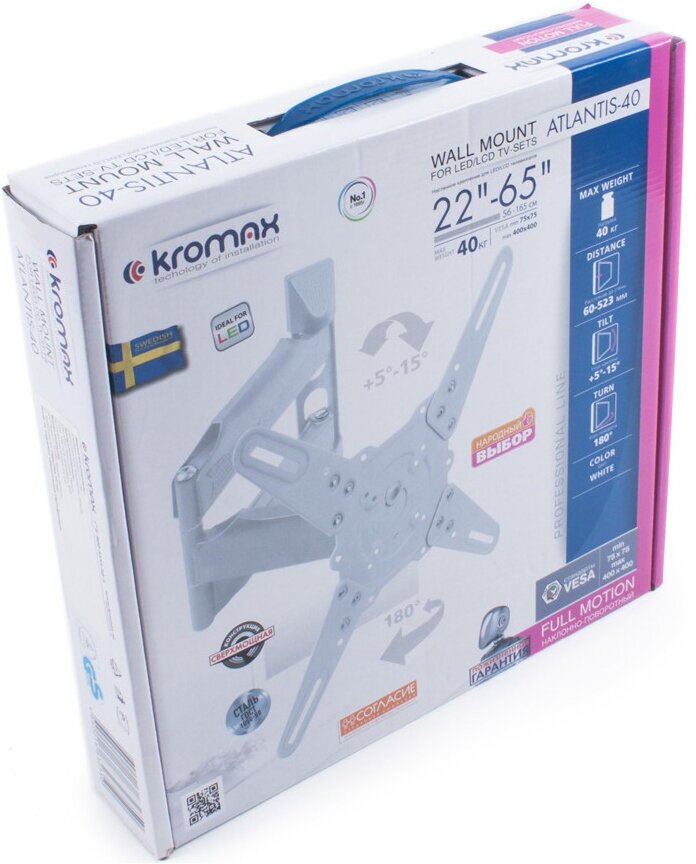 Забудьте о громоздкой мебели и сложных системах крепления. Kromax Atlantis 40 White – это простота, надежность и элегантность в одном устройстве. Наслаждайтесь качественным изображением и современным дизайном вместе с этим кронштейном.