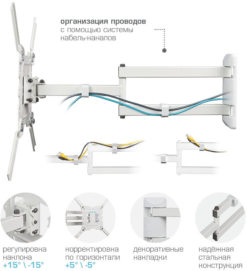 Этот кронштейн разработан с учетом современных требований к безопасности и удобству. Он обеспечивает надежное крепление вашего телевизора к стене, защищая его от случайных падений и повреждений. Благодаря продуманной конструкции, вы сможете легко регулировать положение телевизора, чтобы добиться оптимального угла обзора с любой точки комнаты.