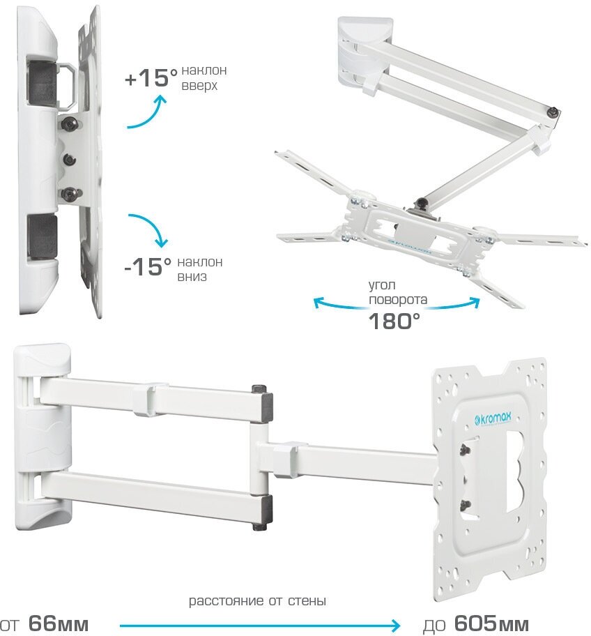 Кронштейн Kromax DIX-18 – это превосходный выбор для тех, кто ценит минимализм и современный дизайн. Белый цвет кронштейна легко впишется в любой интерьер, от классического до хай-тек, добавив ему легкости и свежести. Он станет практически незаметным, позволяя вам полностью сосредоточиться на просмотре любимых фильмов и передач.