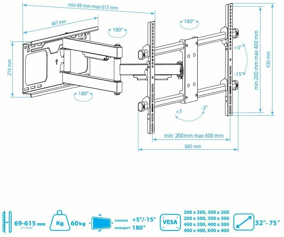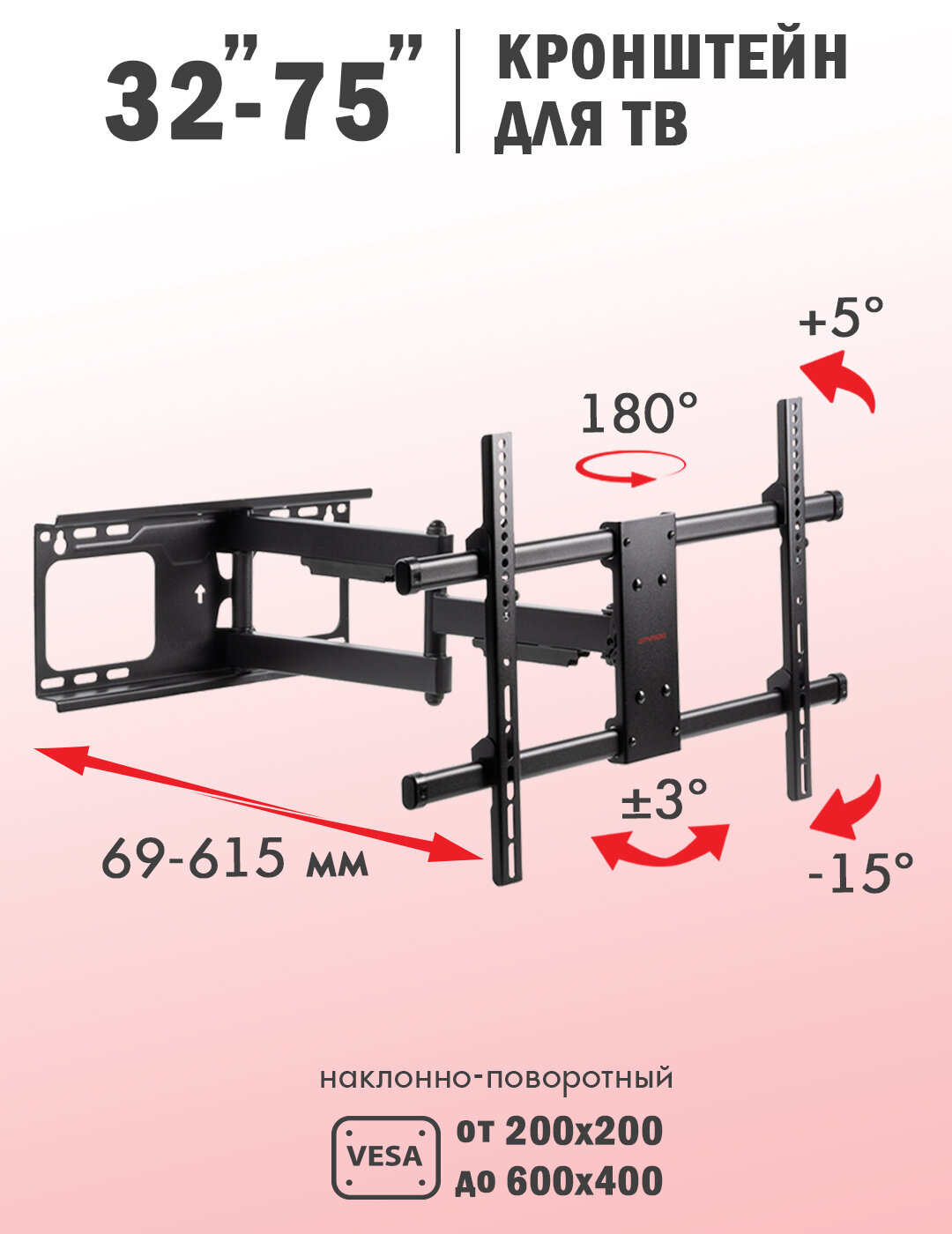 Этот кронштейн предназначен для телевизоров с диагональю от 60 до 75 дюймов, обеспечивая безопасное и надежное крепление. Благодаря своей прочной конструкции, он выдерживает значительный вес, гарантируя безопасность вашего телевизора.