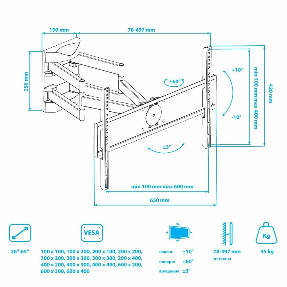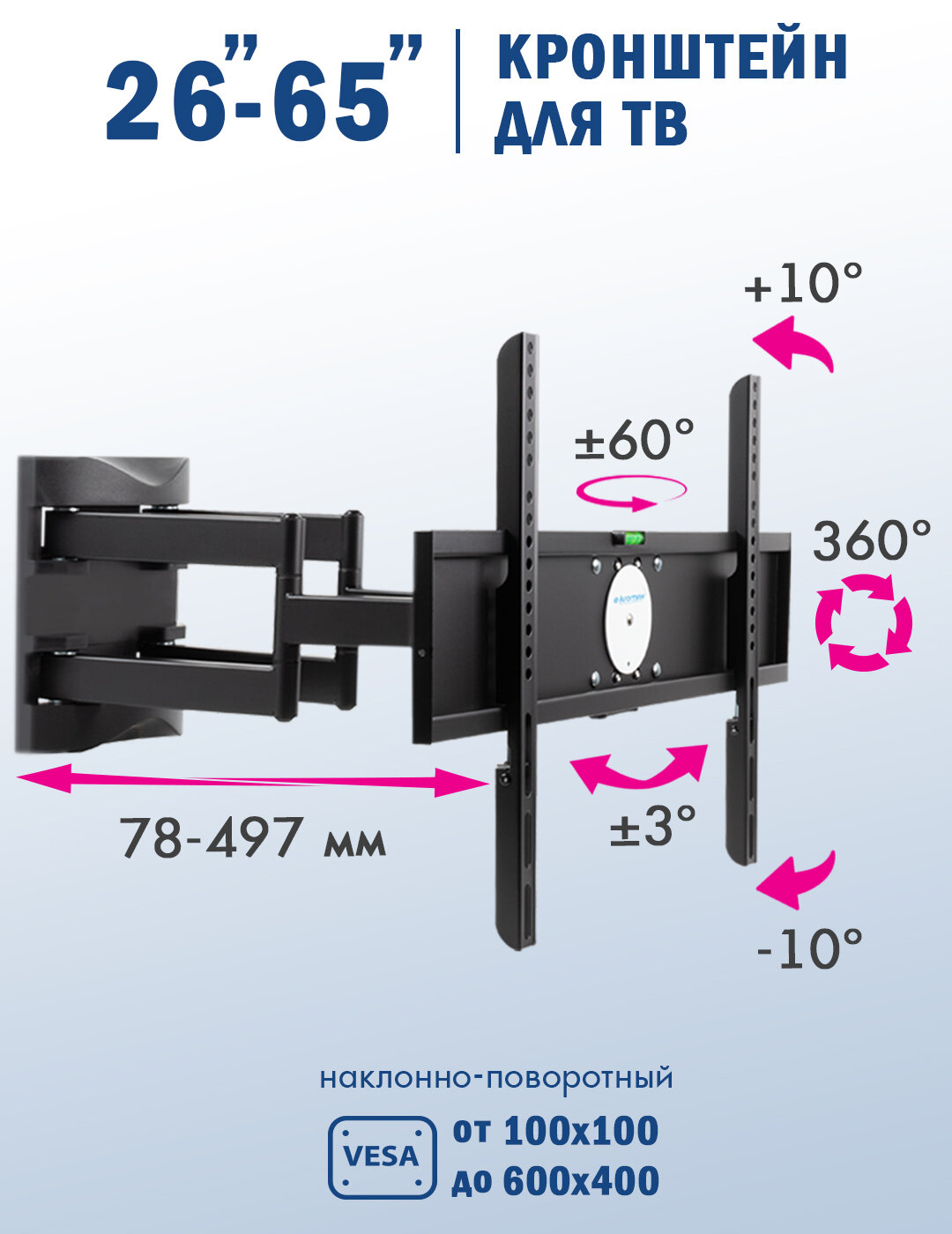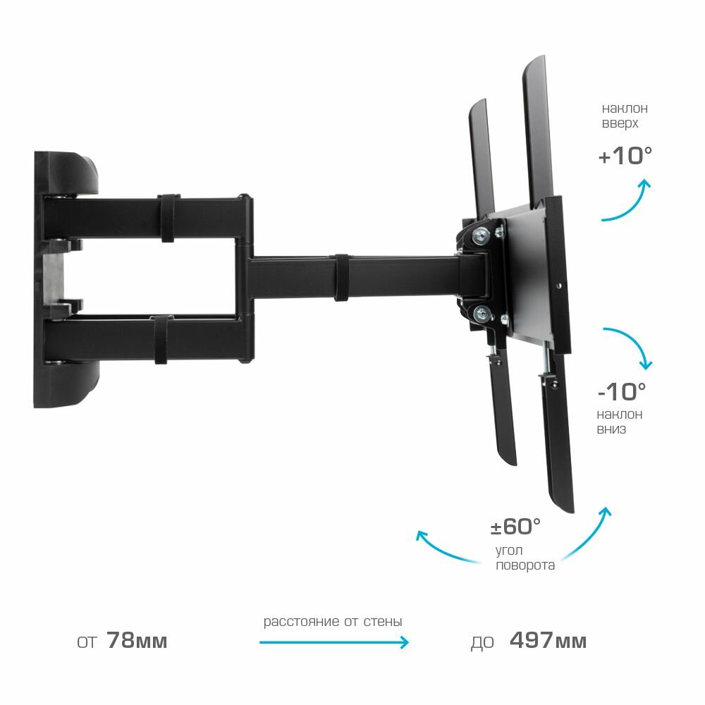 Этот кронштейн разработан специально для телевизоров с диагональю до 65 дюймов, обеспечивая надежную фиксацию и поддержку. Благодаря наклонно-поворотной конструкции, вы сможете легко регулировать положение экрана для оптимального угла обзора из любой точки комнаты.