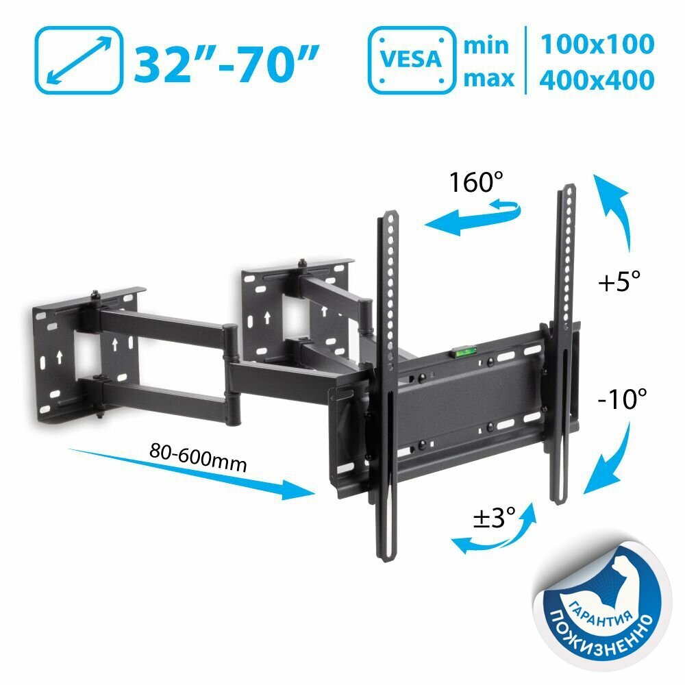 Этот кронштейн обеспечивает безопасное и надежное крепление вашего телевизора, позволяя вам наслаждаться просмотром любимых фильмов и передач с оптимального угла обзора. Прочная конструкция гарантирует долговечность и стабильность, а элегантный черный цвет гармонично впишется в любой дизайн.