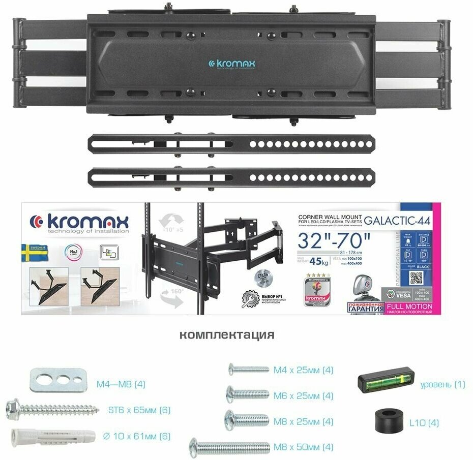 Установка кронштейна Kromax Galactic 44 проста и удобна, благодаря входящему в комплект набору крепежных элементов и понятной инструкции. Вы сможете быстро и легко закрепить свой телевизор на стене, освободив место в комнате и придав ей более аккуратный и современный вид.