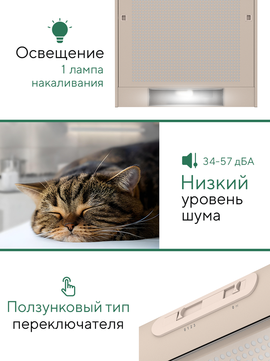 Кремовый цвет корпуса придает вытяжке изысканный и утонченный вид, гармонично сочетаясь с различными стилями кухонного интерьера. Она станет не только полезным, но и привлекательным элементом вашей кухни.