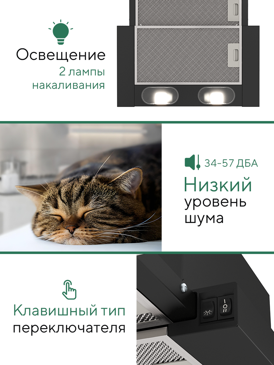 Сочетание черного цвета и нержавеющей стали придает вытяжке современный и элегантный вид, который гармонично дополнит любой стиль кухни. Прочные материалы гарантируют долговечность и надежность в эксплуатации.