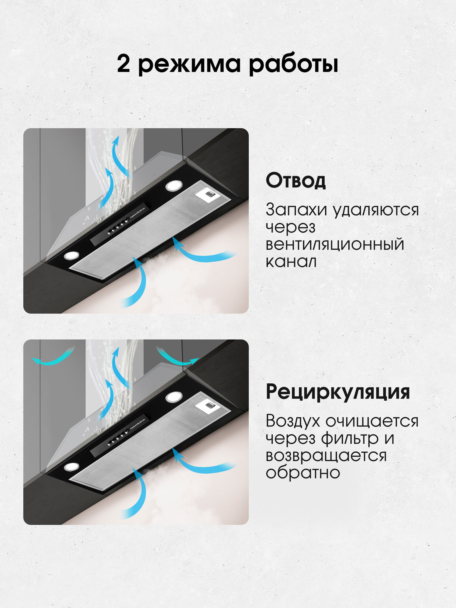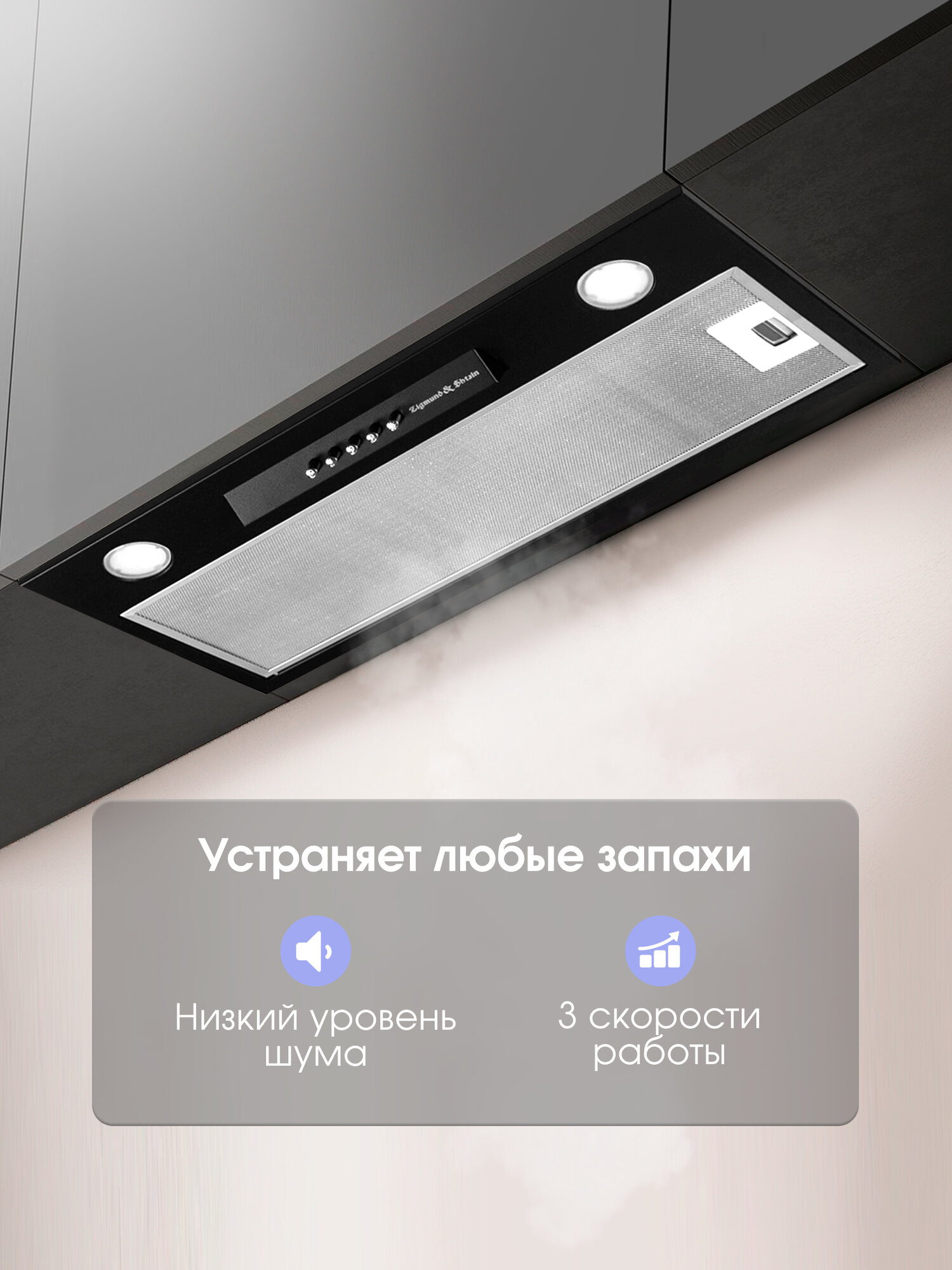 Элегантный черный цвет вытяжки придает ей современный и изысканный вид. Легкость в управлении и простота в уходе делают эту модель отличным выбором для любой хозяйки. Вы забудете о неприятных запахах и жировом налете на мебели, наслаждаясь процессом приготовления любимых блюд.