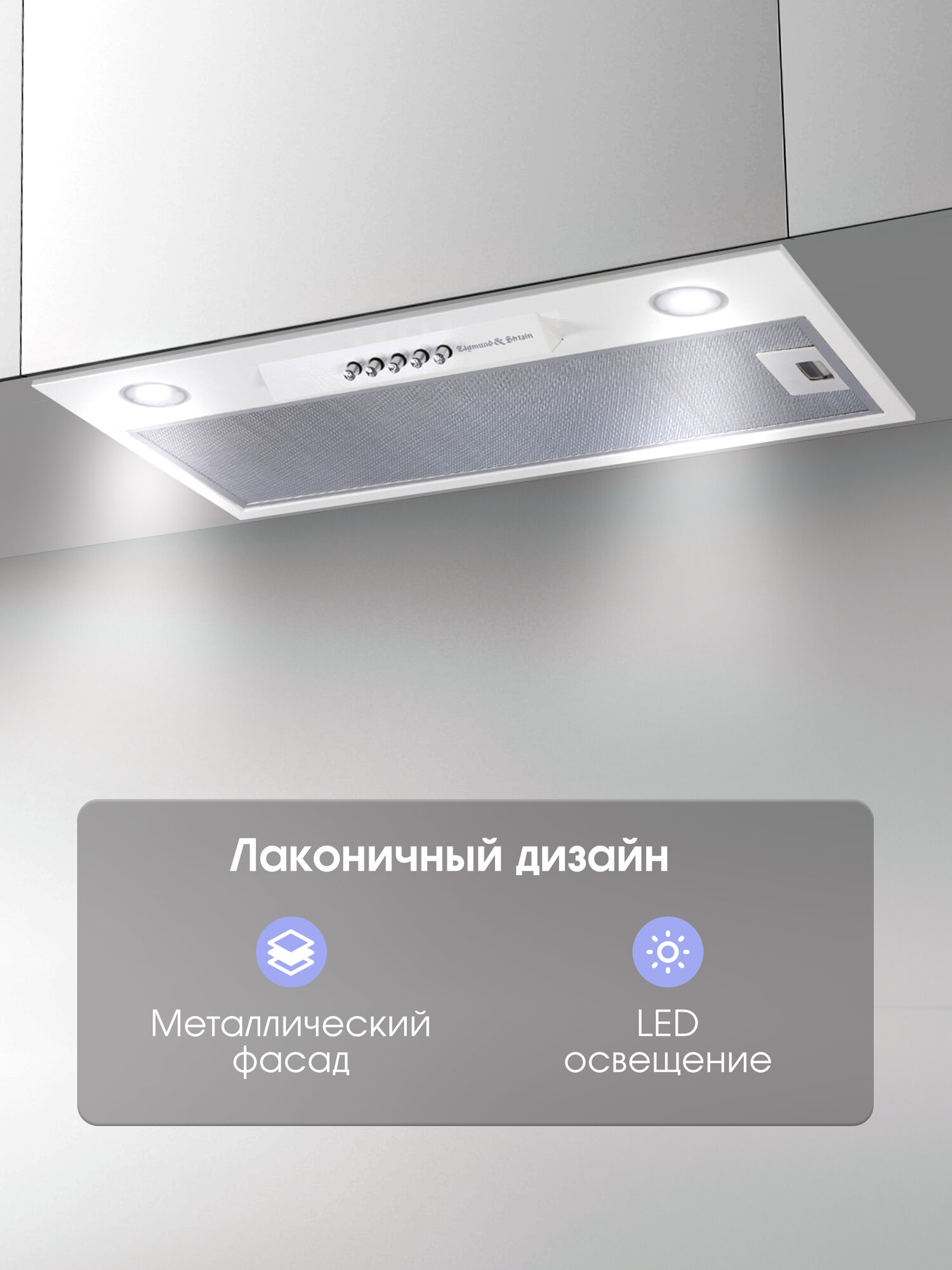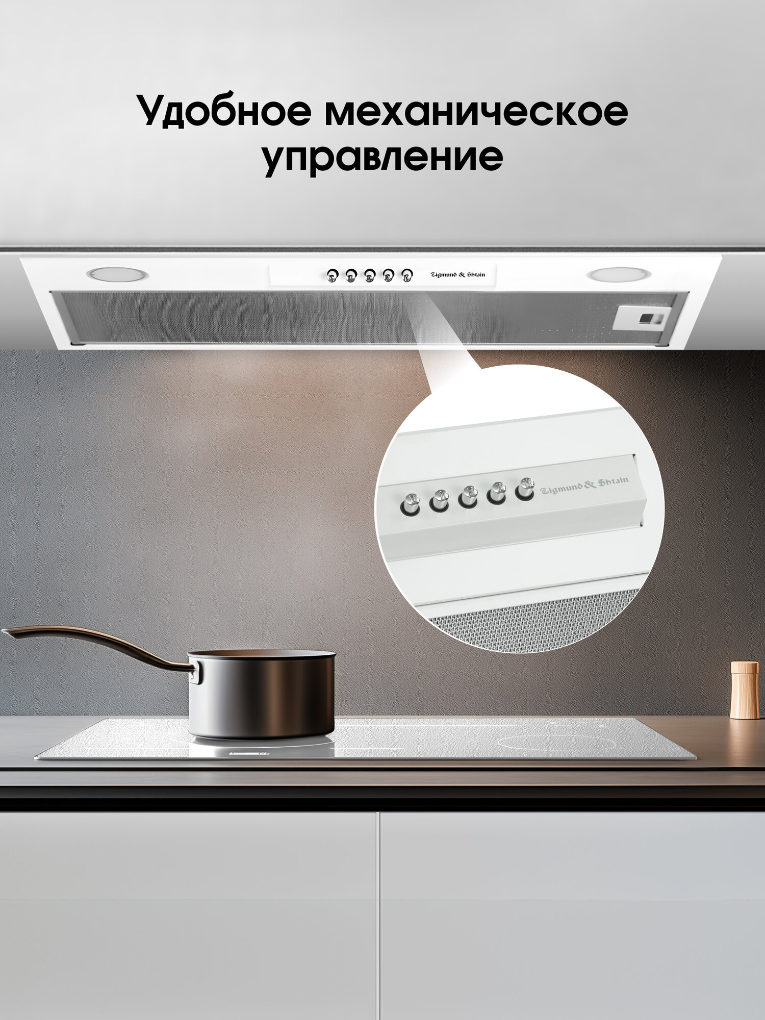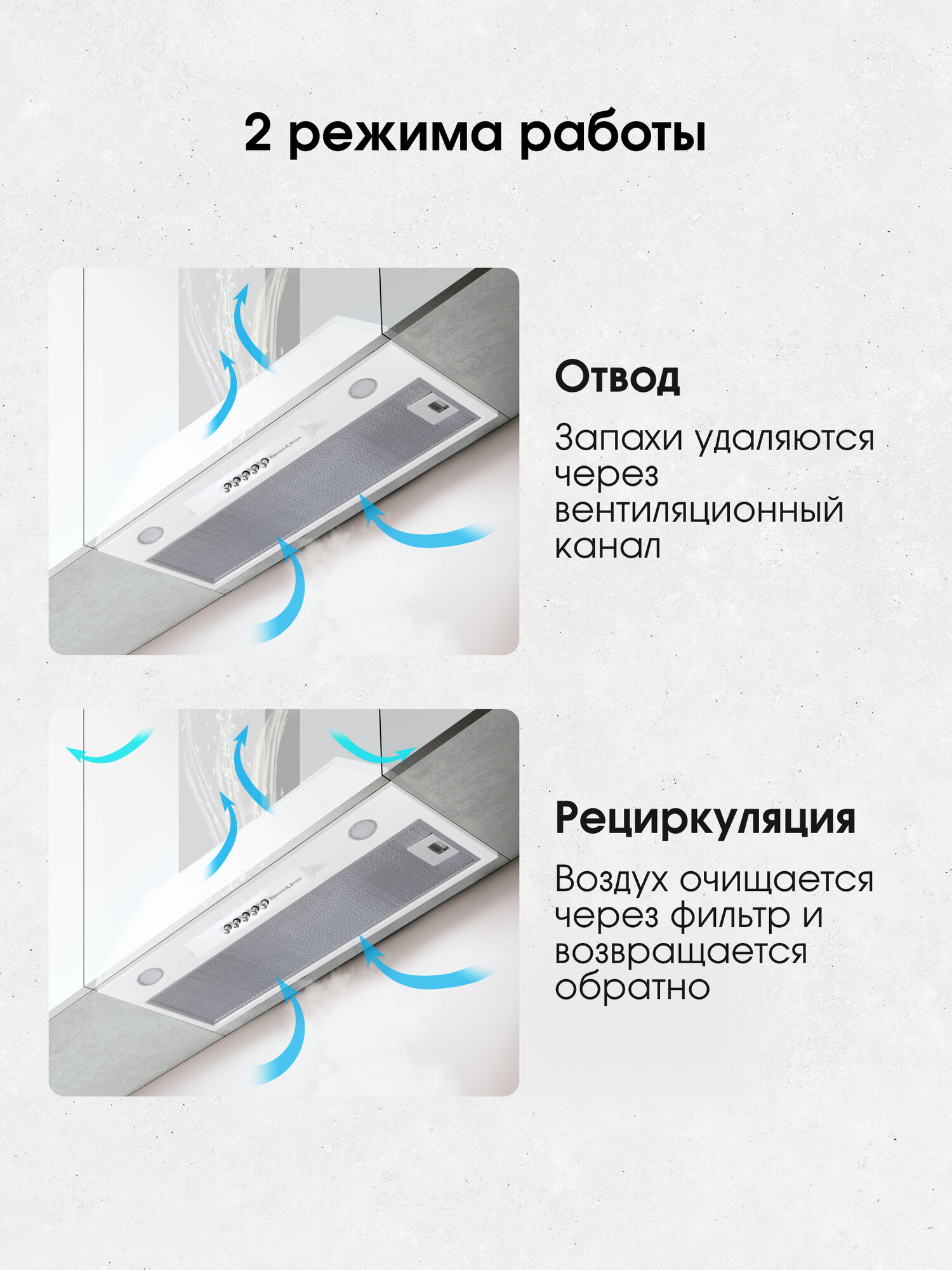 Эта вытяжка, элегантно интегрируемая в кухонный гарнитур, не только эффективно очищает воздух, но и экономит пространство, не нарушая гармонию интерьера. Ее современный дизайн, выполненный в стильном белом цвете, легко впишется в любой кухонный стиль, от классики до модерна.
