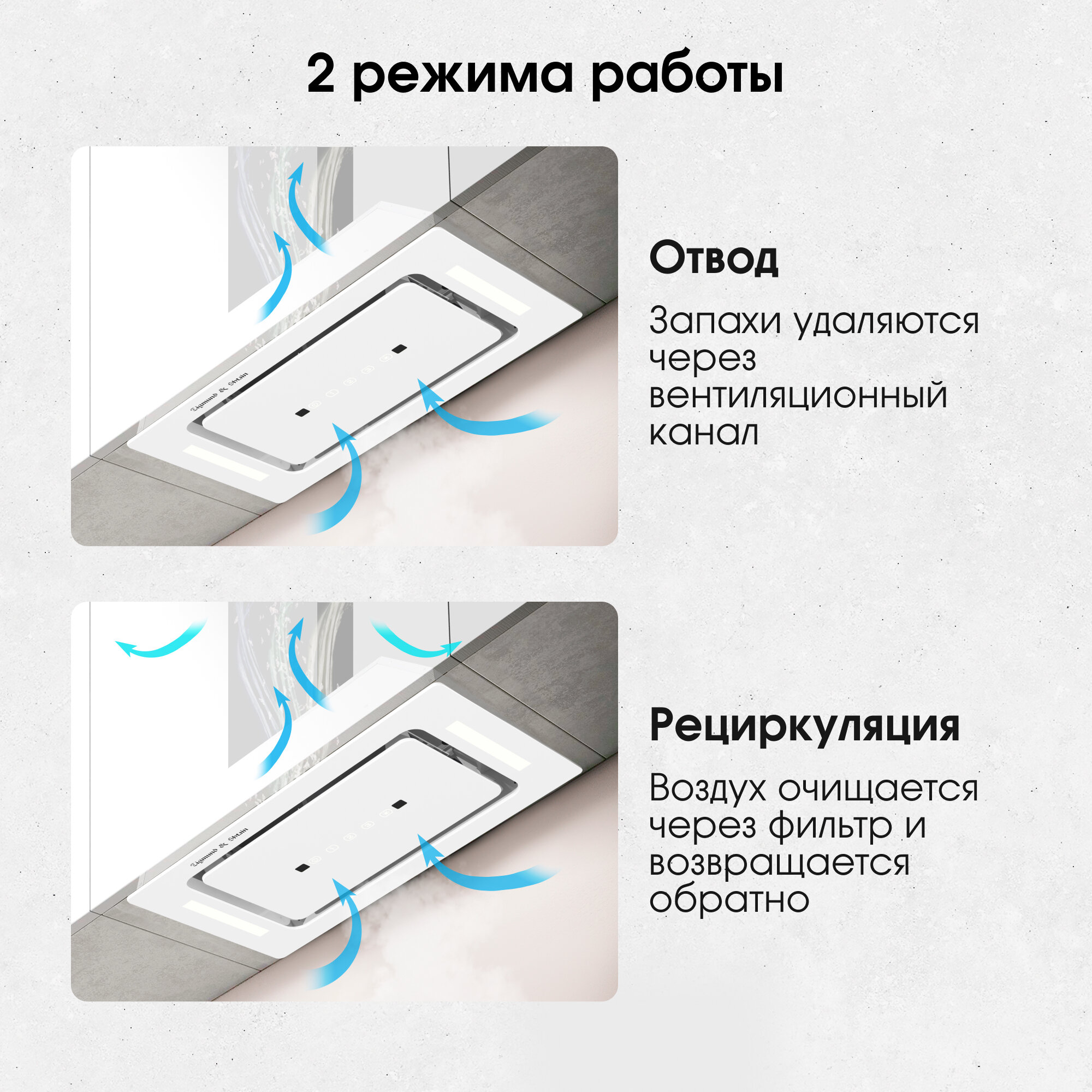 Благодаря высокой мощности, вытяжка эффективно удаляет запахи, пар и дым, обеспечивая чистый и свежий воздух на вашей кухне. Вам больше не придется беспокоиться о неприятных запахах, распространяющихся по всему дому во время приготовления пищи.