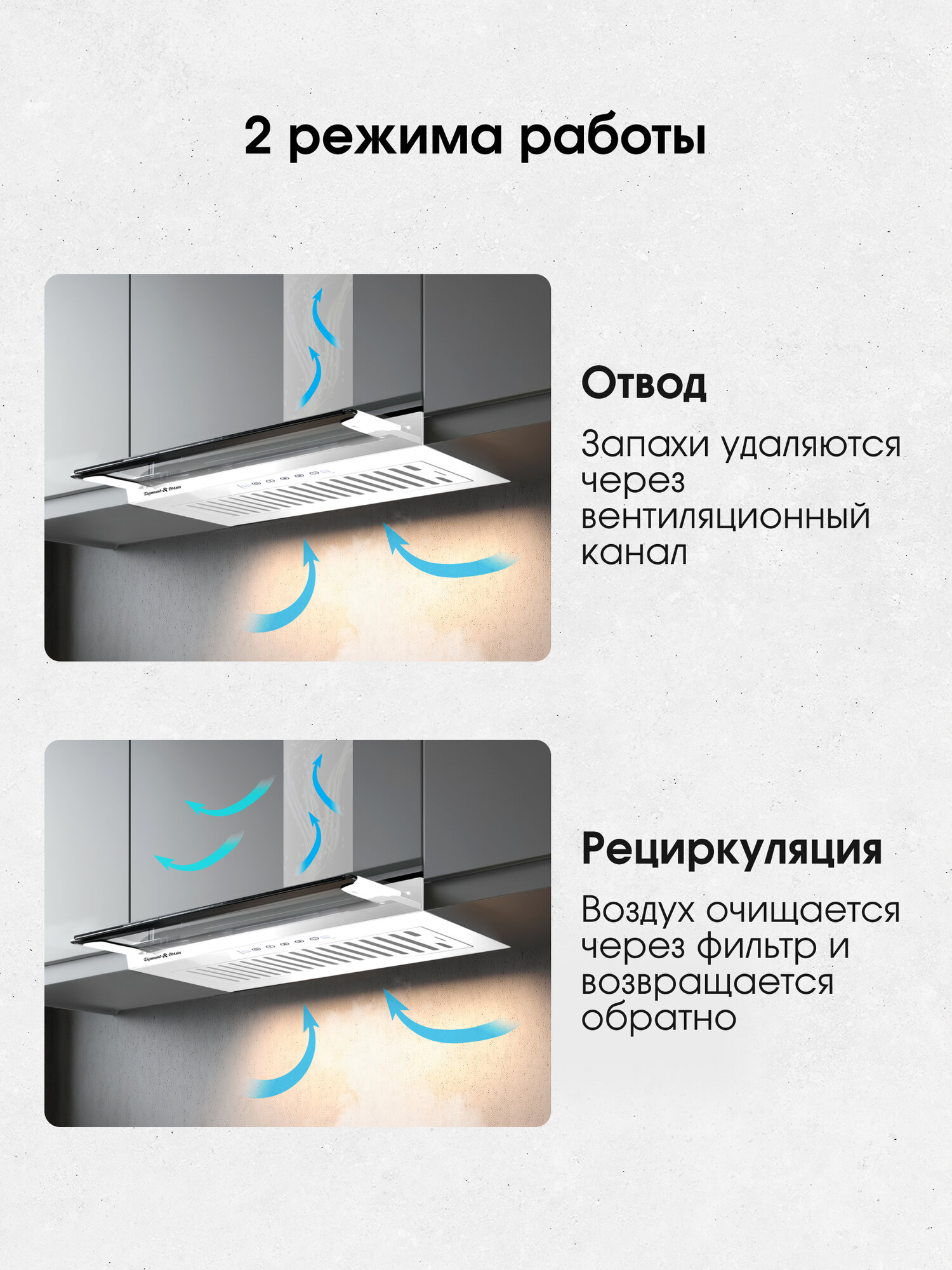 Высокая производительность этой модели позволяет быстро и эффективно очищать воздух даже в больших кухнях. Забудьте о неприятных запахах после жарки или варки – вытяжка справится с любыми задачами, поддерживая свежесть и чистоту воздуха.