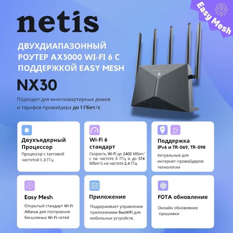 Netis NX30 – это не просто маршрутизатор, это надежный партнер для вашей цифровой жизни. Он обеспечит стабильную и безопасную связь для всех ваших устройств, позволяя вам оставаться на связи с миром в любое время и в любом месте.