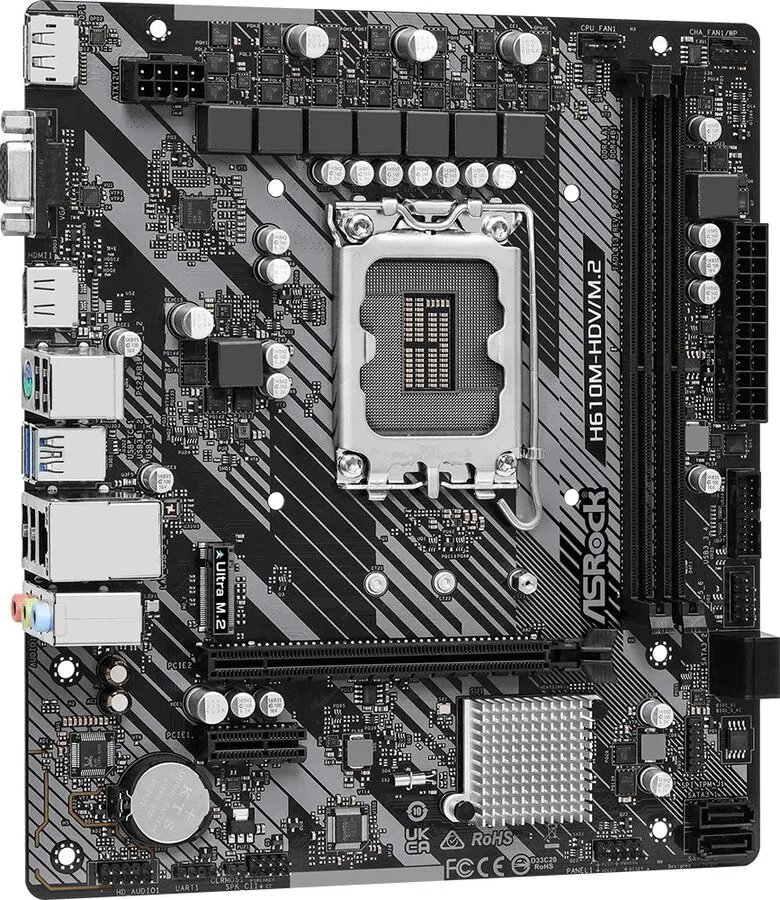 Ищете надежную и производительную материнскую плату для сборки компьютера на базе процессоров Intel Core 14-го, 13-го или 12-го поколения? ASRock H610M-HDV – это отличное решение, сочетающее в себе современный функционал, компактный форм-фактор MicroATX и доступную цену. Эта материнская плата станет крепким фундаментом для вашего нового ПК, будь то игровой компьютер, рабочая станция или мультимедийный центр.