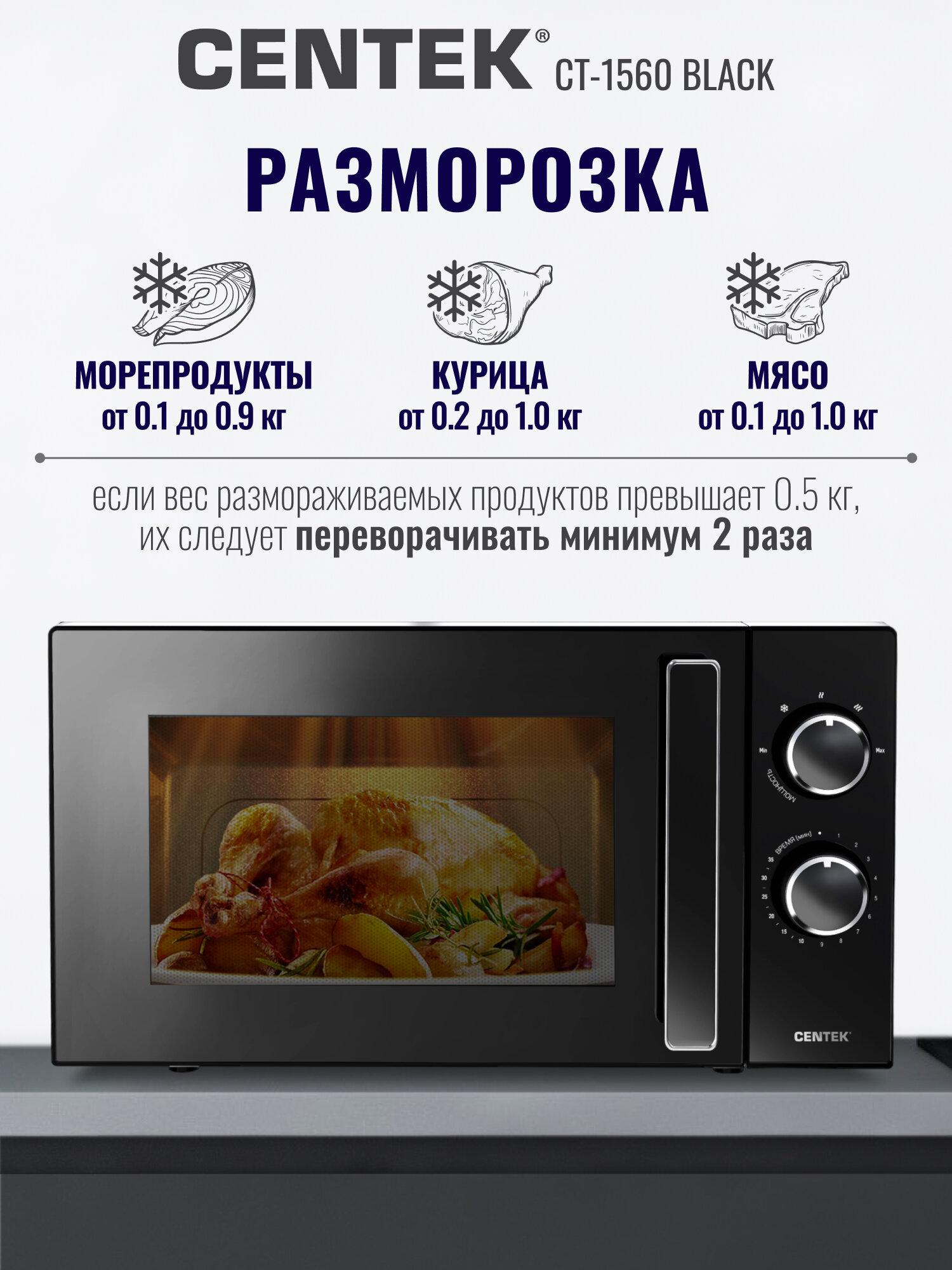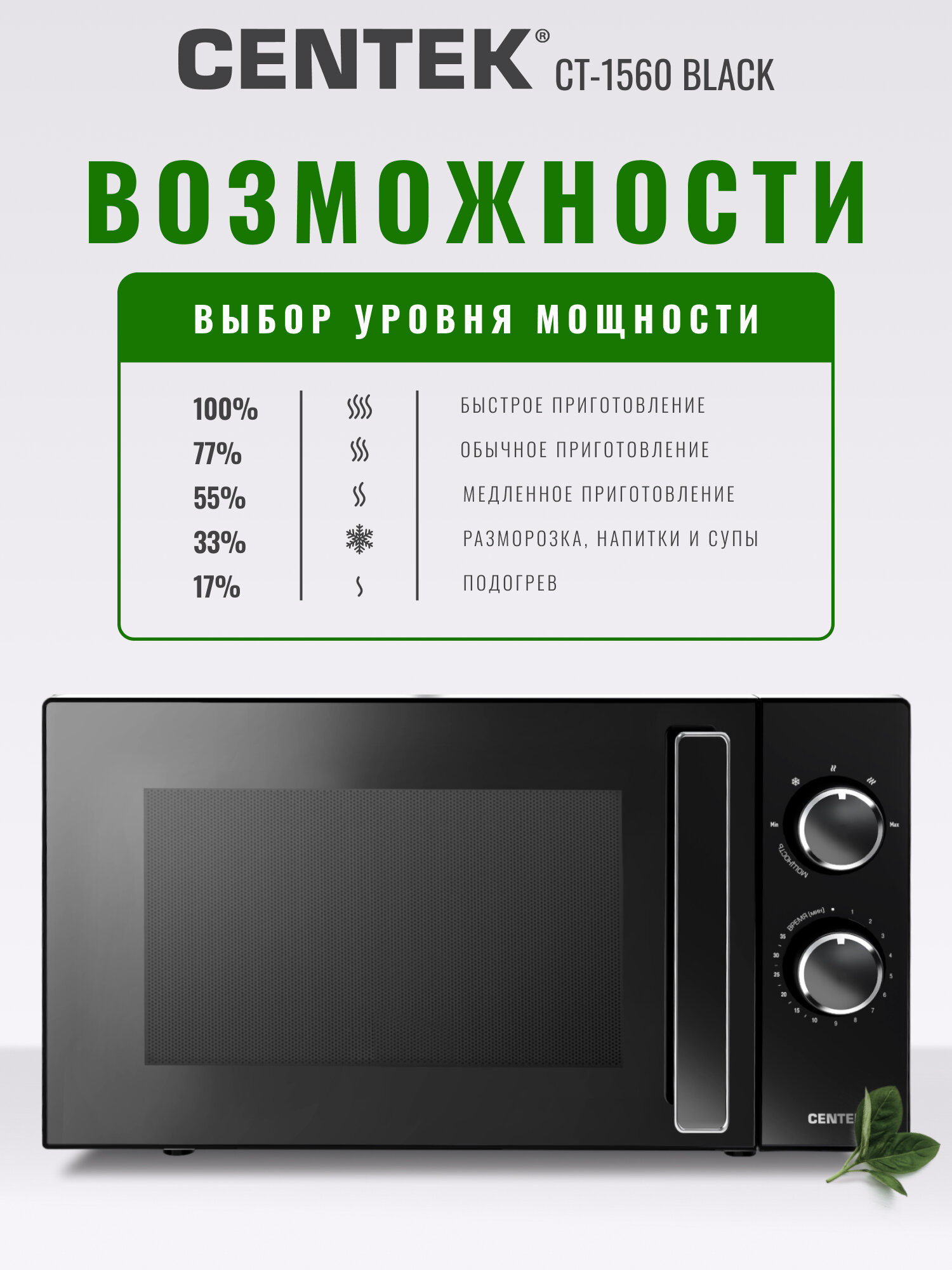 Centek CT-1560 Black – это надежная и функциональная микроволновая печь, которая станет вашим верным помощником на кухне. Она сочетает в себе стильный дизайн, простоту использования и широкие возможности для разогрева и приготовления пищи. Забудьте о долгих часах у плиты – с Centek CT-1560 Black вы сможете быстро и легко приготовить вкусный и сытный обед или ужин!