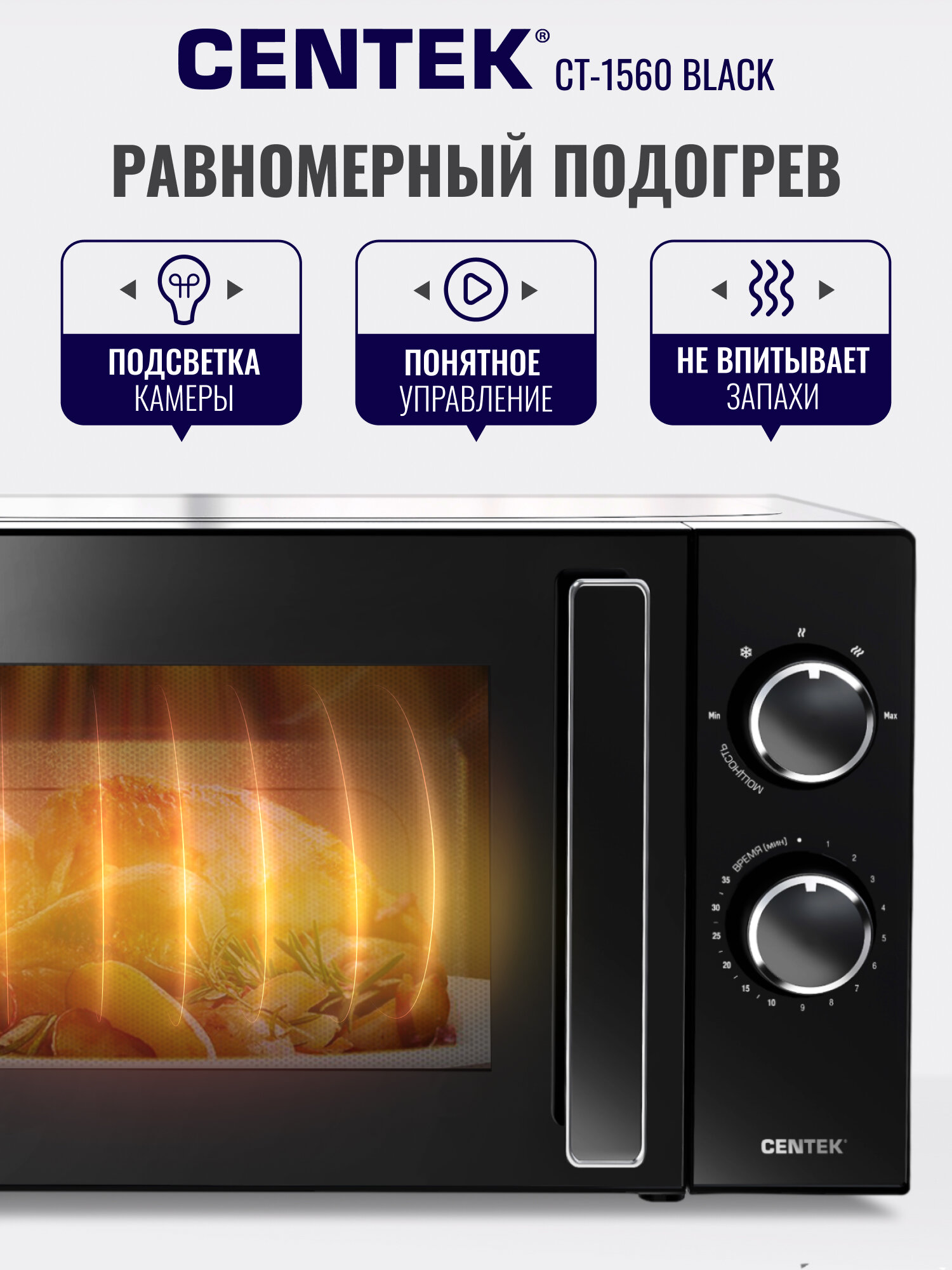 Простое и интуитивно понятное управление делает использование Centek CT-1560 Black максимально комфортным. Вы быстро освоите основные функции и режимы, и сможете с легкостью задавать необходимое время и мощность для разогрева или приготовления пищи.