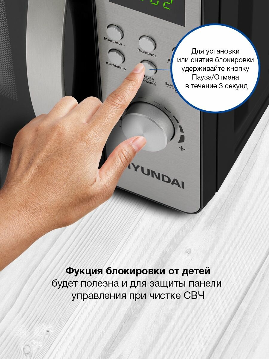 Hyundai HYM-D2074 оснащена богатым набором полезных функций и эргономичной электроникой. Выбор необходимого режима термической обработки осуществляется при помощи шести кнопок на передней панели данной модели. Первая регулирует мощность, вторая отвечает за экспресс-разогрев, третья – за разморозку и установку часов, четвертая – автоменю индивидуальными настройками для разных блюд (попкорн, подогрев, напиток, пицца, картофель, овощи, мясо, рыба), пятая – пауза или отмена текущего процесса, а последняя – быстрый старт. Благодаря электронике и яркому жидкокристаллическому дисплею установить необходимые опции под разные продукты не составит труда. Остальные настройки позволяет сделать колесо под клавишами. Данная модель работает на пяти возможных уровнях мощности, а таймер предусматривает до 60 минут разогрева. Помимо этого, в печь интегрирована эффективная система защиты от детей, которая включается долгим нажатием на кнопку паузы/отмены. Внутри устройство отделано эмалью лёгкой очистки. С неё легко удаляются любые загрязнения при помощи самых обычных средств и домашнего инвентаря. Дизайн Hyundai HYM-D2074 выполнен в лаконичном чёрном цвете, так что микроволновка гармонично впишется в интерьер любой кухни. По окончанию работы Hyundai HYM-D2074 издаёт громкий характерный сигнал.
