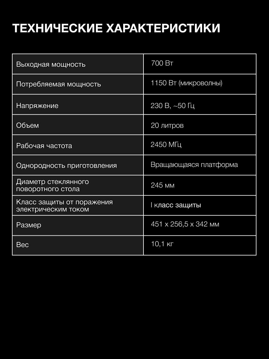 Hyundai HYM-M2003 – это отличный выбор для тех, кто ценит свое время и стремится к удобству в повседневной жизни. Благодаря оптимальному объему и мощности, эта микроволновая печь легко справится с широким спектром задач – от разогрева готовых блюд до размораживания продуктов и приготовления простых рецептов. Больше не нужно тратить драгоценные минуты на долгую готовку – с Hyundai HYM-M2003 горячий обед или ужин всегда под рукой!