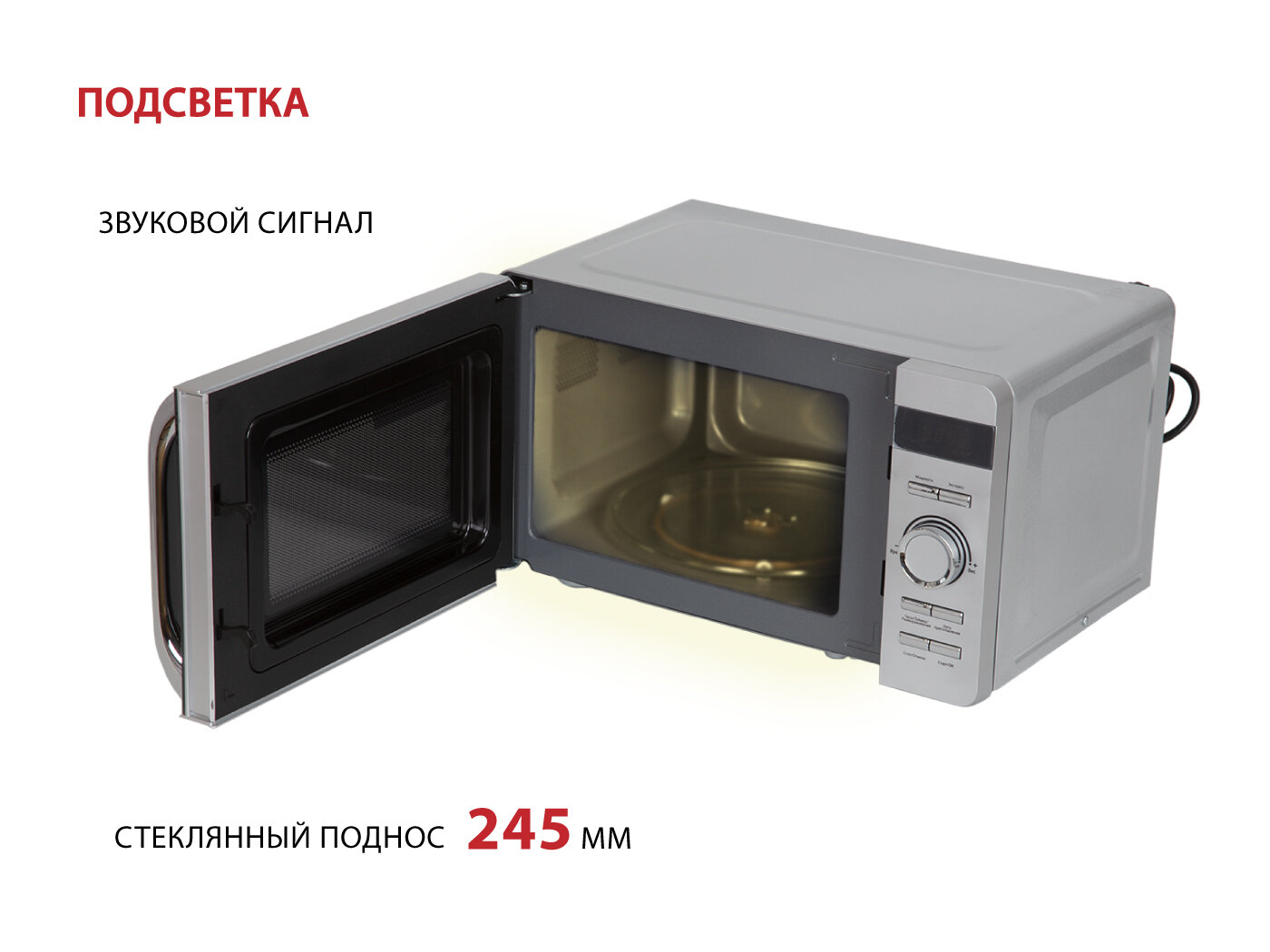 Эта микроволновка станет вашим незаменимым помощником в повседневной кулинарии. Благодаря оптимальному объему внутренней камеры, она идеально подойдет для разогрева порций любого размера – от небольших тарелок до крупных блюд.