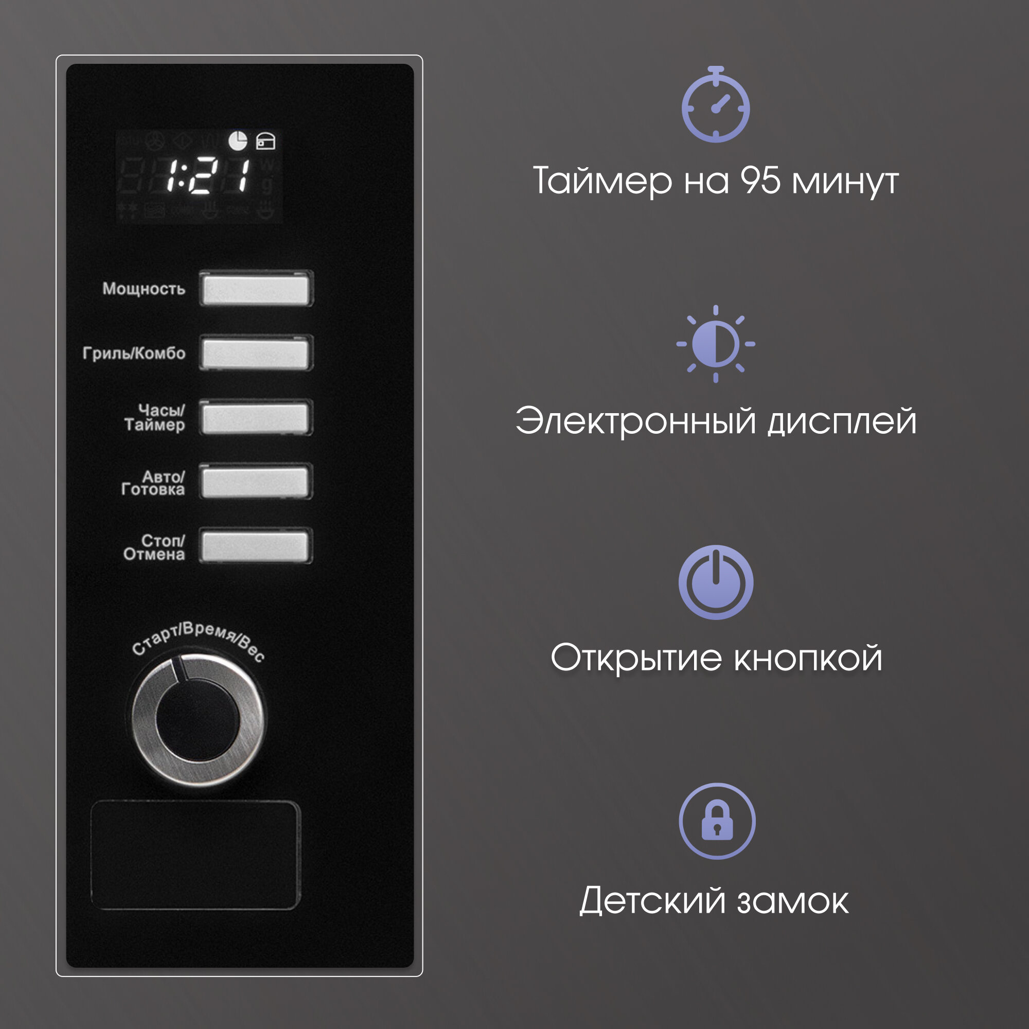 Эта микроволновая печь легко встраивается в кухонный гарнитур, экономя пространство и создавая единый, гармоничный стиль. Черный цвет придает ей изысканность и современность, позволяя ей органично вписаться в любой интерьер.