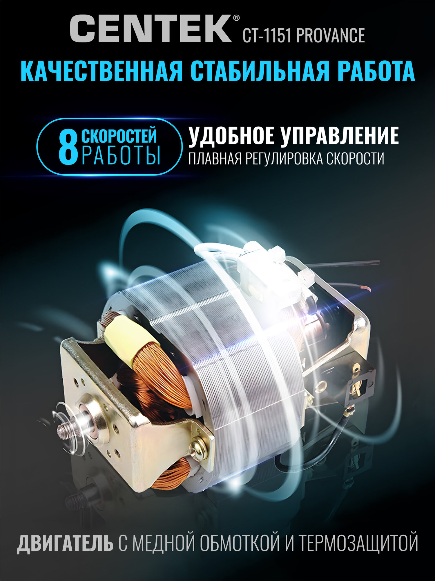 Продуманная конструкция и простое управление делают работу с миксером Centek CT-1151 максимально комфортной и приятной. Он станет вашим верным помощником на кухне, помогая создавать вкусные и красивые блюда без лишних усилий.