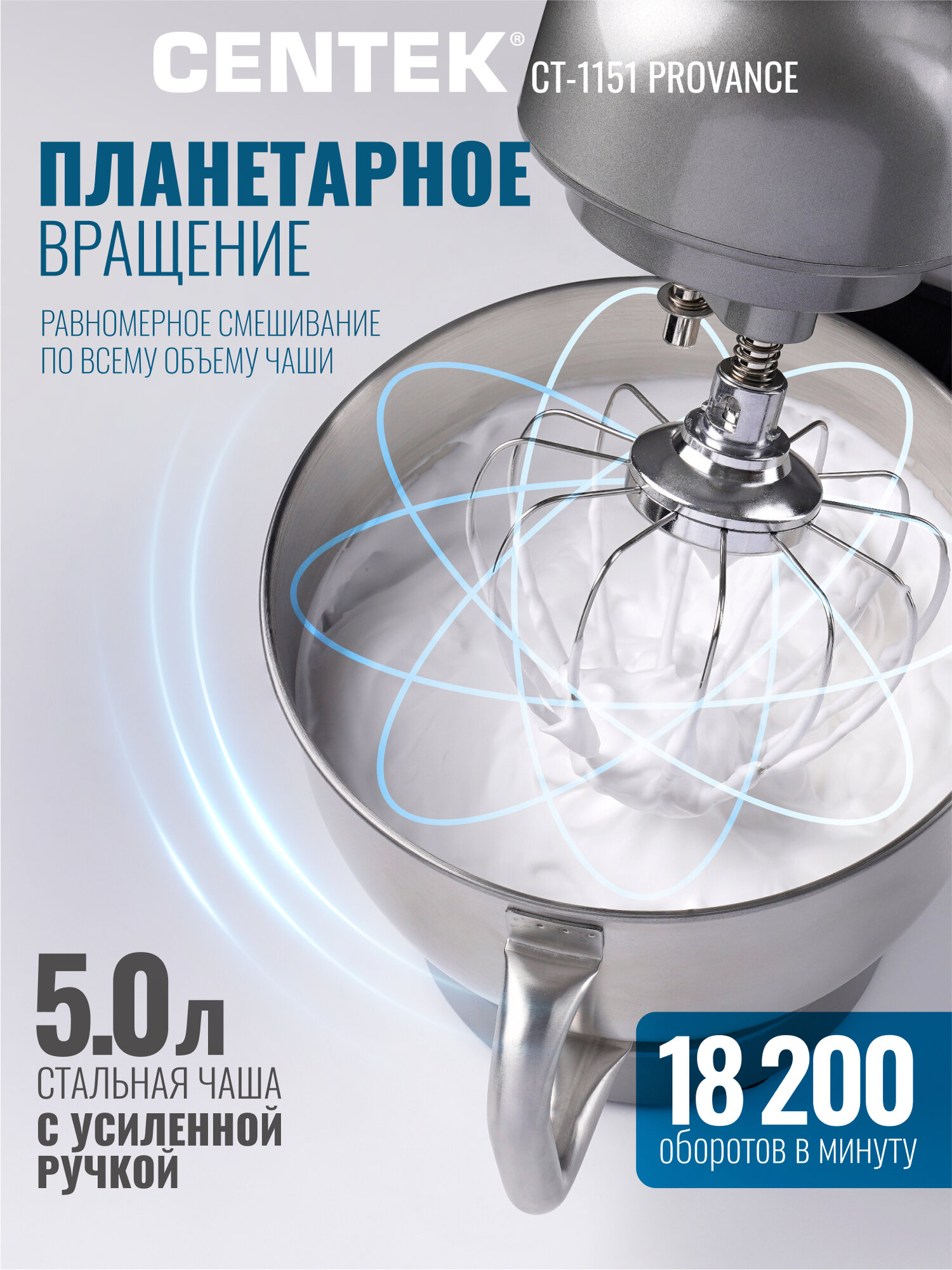 Мечтаете о легком и приятном процессе приготовления любимых блюд? Представляем вам планетарный миксер Centek CT-1151 – незаменимого помощника на вашей кухне, который с легкостью справится с самыми сложными кулинарными задачами. Этот миксер станет вашим надежным партнером в создании кулинарных шедевров, от воздушных бисквитов до густого теста для пирогов.