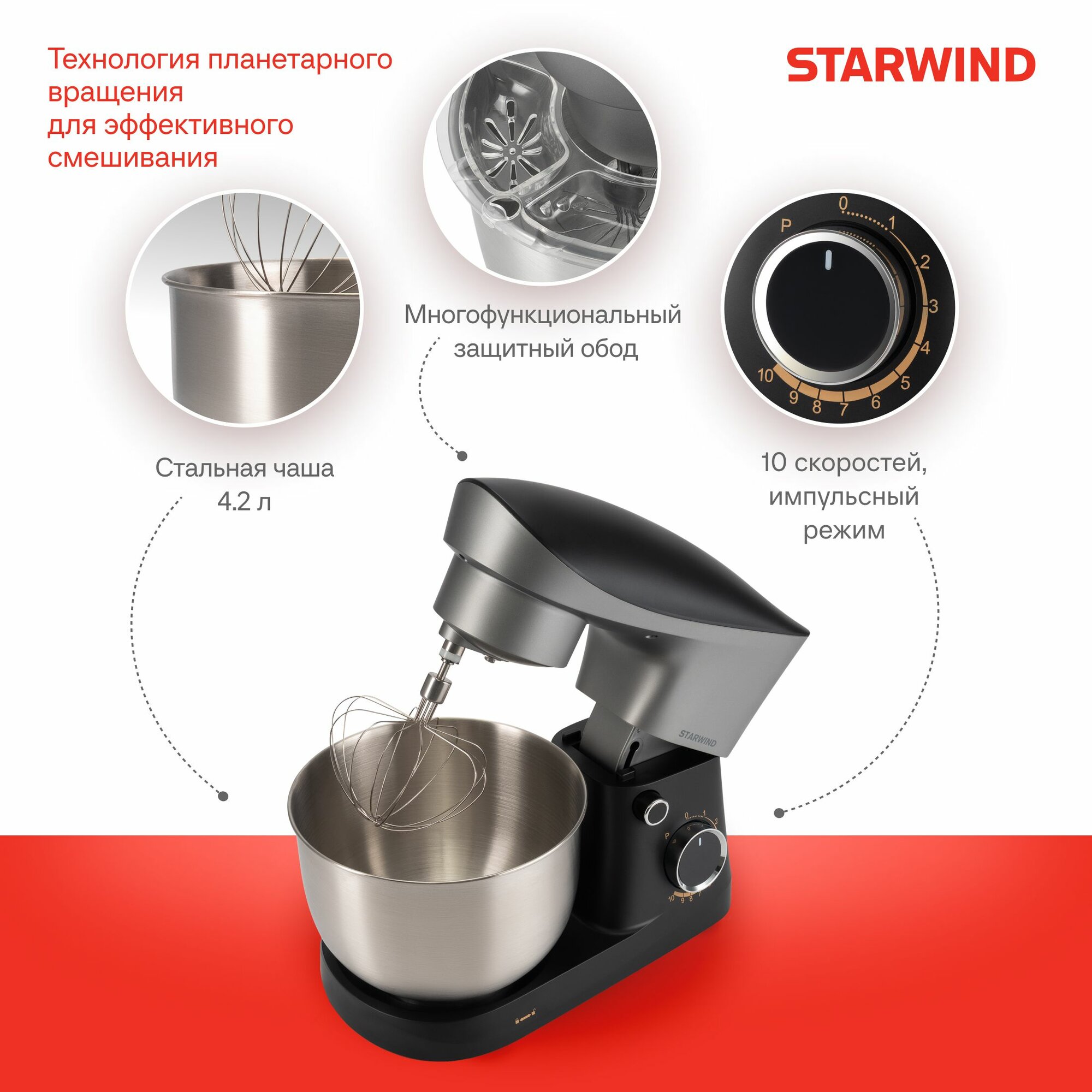 Ищете надежного помощника на кухне? Планетарный миксер Starwind SPM2251 – это мощное и стильное решение для приготовления самых разнообразных блюд. Сочетание элегантного черного и серебристого цветов делает его не только функциональным, но и эстетичным дополнением к вашему кухонному интерьеру.