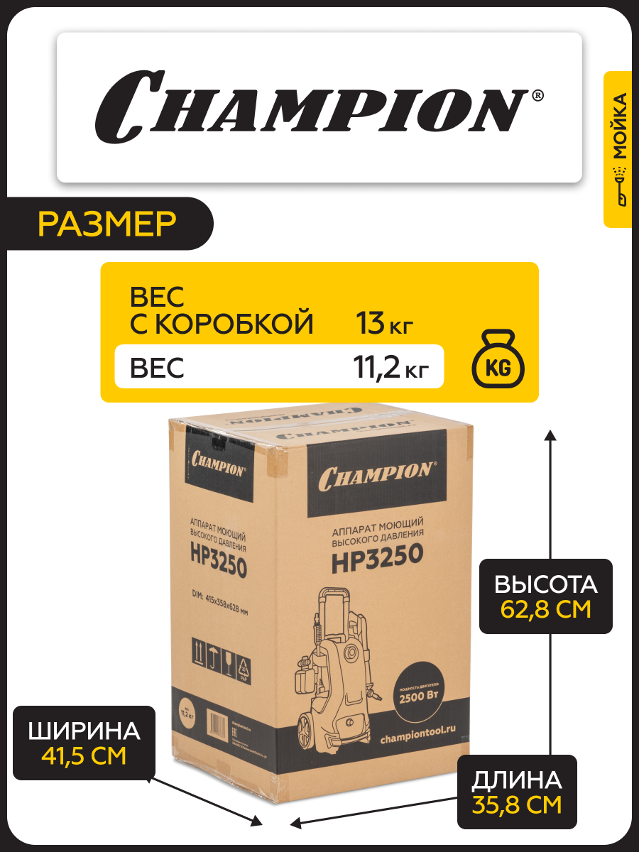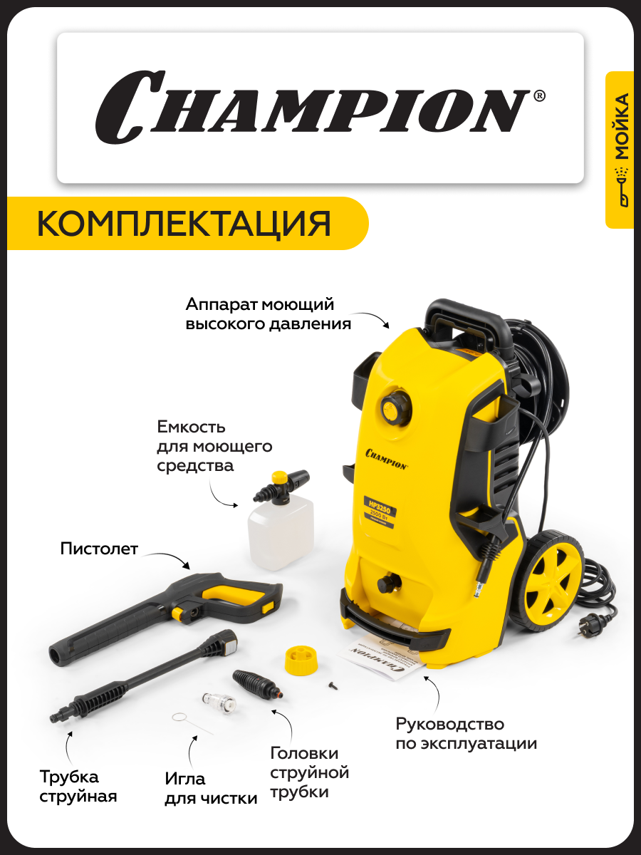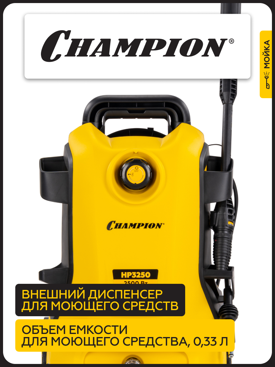 Ищете надежного помощника для уборки на даче, во дворе или в гараже? Мойка высокого давления Champion HP3250 – это идеальное решение для тех, кто ценит чистоту и порядок. Этот мощный агрегат позволяет быстро и эффективно справиться с самыми разными задачами: от мойки автомобиля и садовой техники до очистки фасадов зданий и террас.