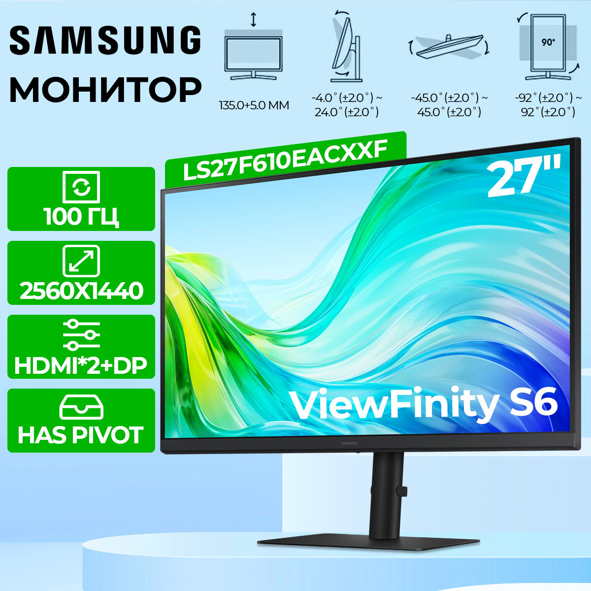 С монитором Samsung ViewFinity S6 вы получите не только превосходное качество изображения и удобство использования, но и стильный аксессуар, который подчеркнет вашу индивидуальность. Инвестируйте в комфорт и продуктивность – выбирайте Samsung ViewFinity S6!