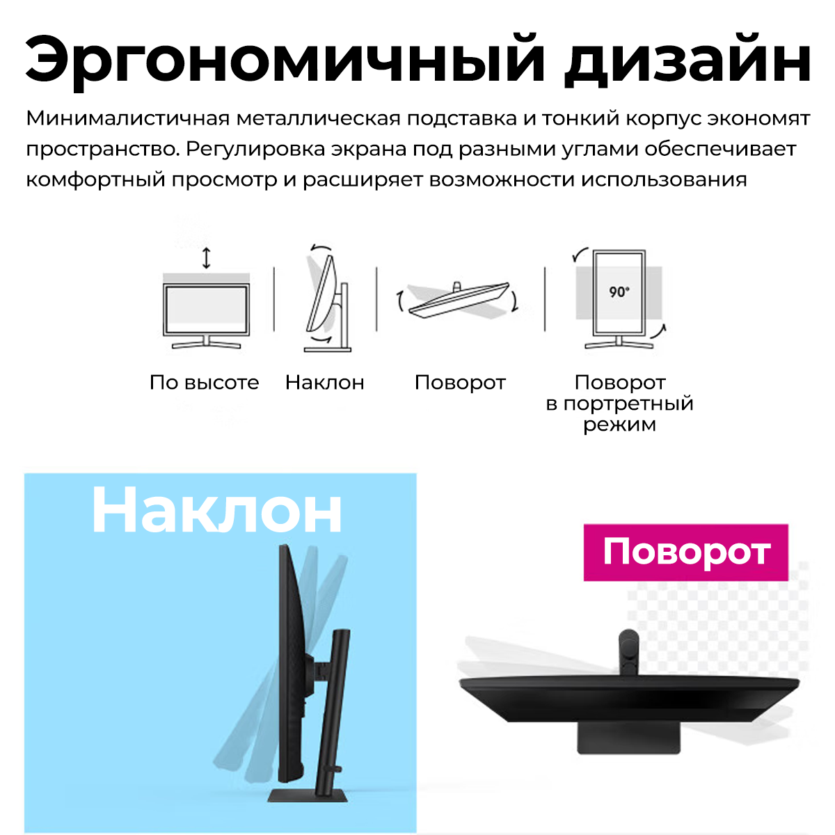 Эргономичный дизайн этого монитора разработан для максимального комфорта при длительной работе. Регулируемая подставка позволяет настроить высоту, наклон и поворот экрана, чтобы найти оптимальное положение для вашей шеи и глаз. Функция поворота экрана в портретный режим значительно расширяет возможности использования монитора, особенно при работе с текстовыми документами или программировании.