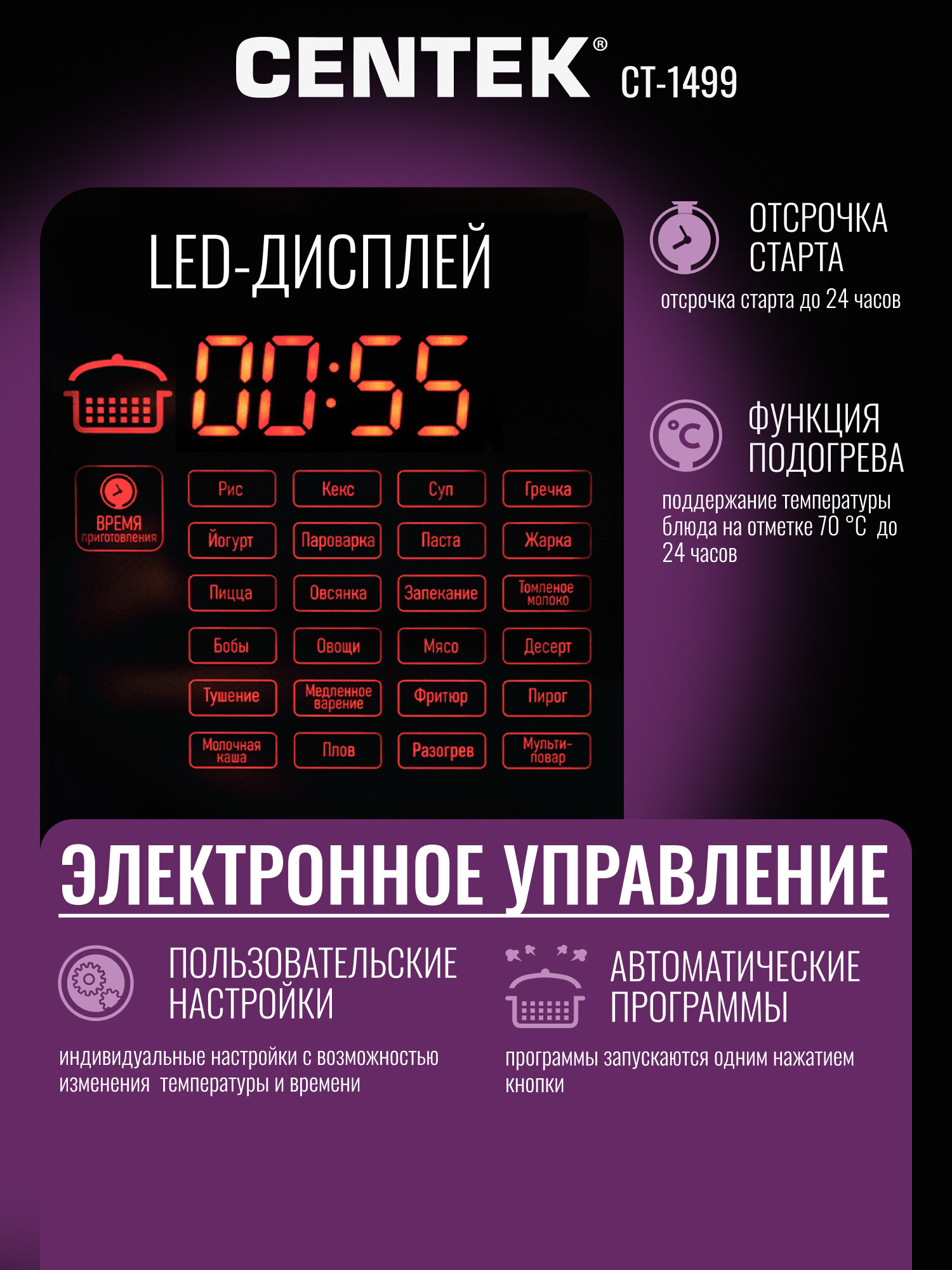 С мультиваркой Centek CT-1499 вы сэкономите время и силы, которые сможете потратить на более приятные занятия. Наслаждайтесь вкусной и здоровой едой каждый день, не тратя часы на приготовление!