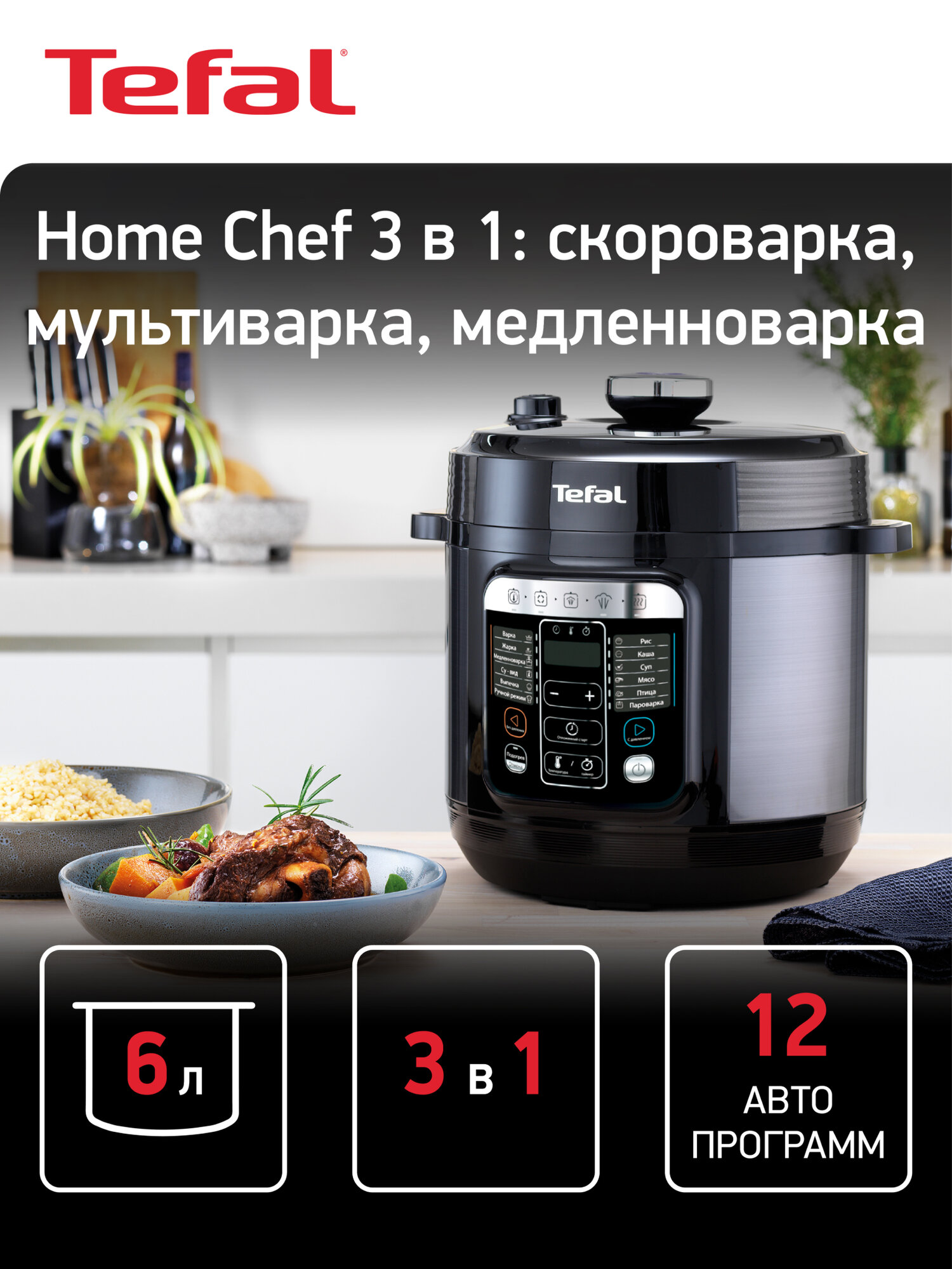 Ищете универсального помощника на кухню, который сэкономит ваше время и упростит приготовление любимых блюд? Мультиварка-скороварка Tefal Home Chef Smart Multicooker CY601832 станет идеальным решением! Этот многофункциональный прибор объединяет в себе возможности мультиварки и скороварки, позволяя готовить разнообразные блюда быстро, вкусно и полезно.