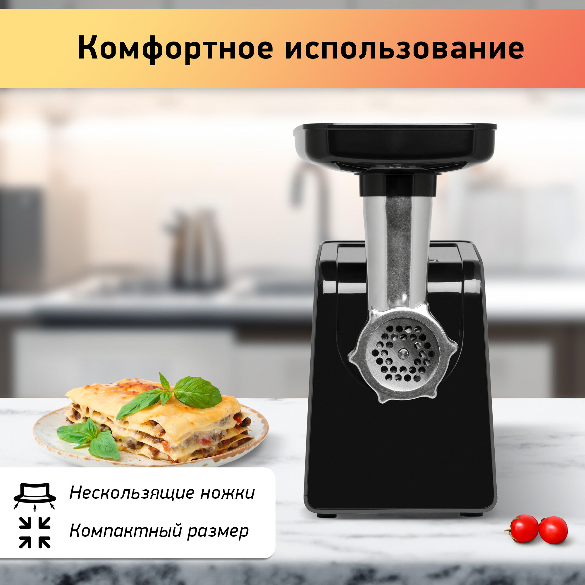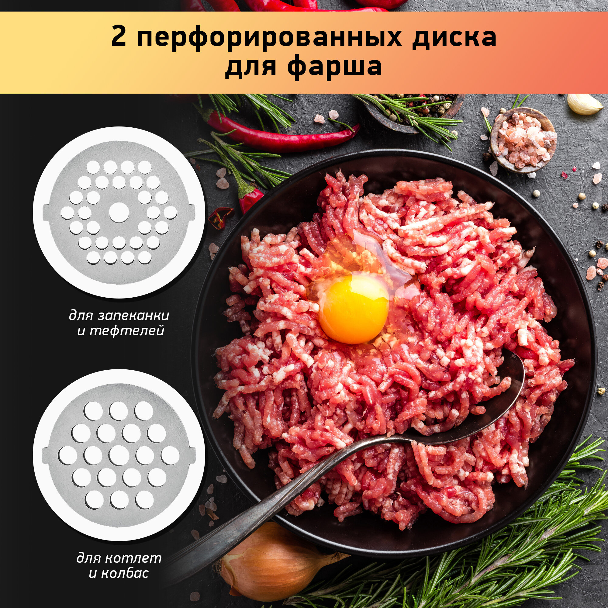 В комплекте с мясорубкой поставляются различные насадки, которые расширяют ее функциональность. Теперь вы сможете не только делать фарш, но и готовить домашние колбаски, сосиски и даже формировать печенье! Экспериментируйте с рецептами и радуйте своих близких вкусными и полезными блюдами.