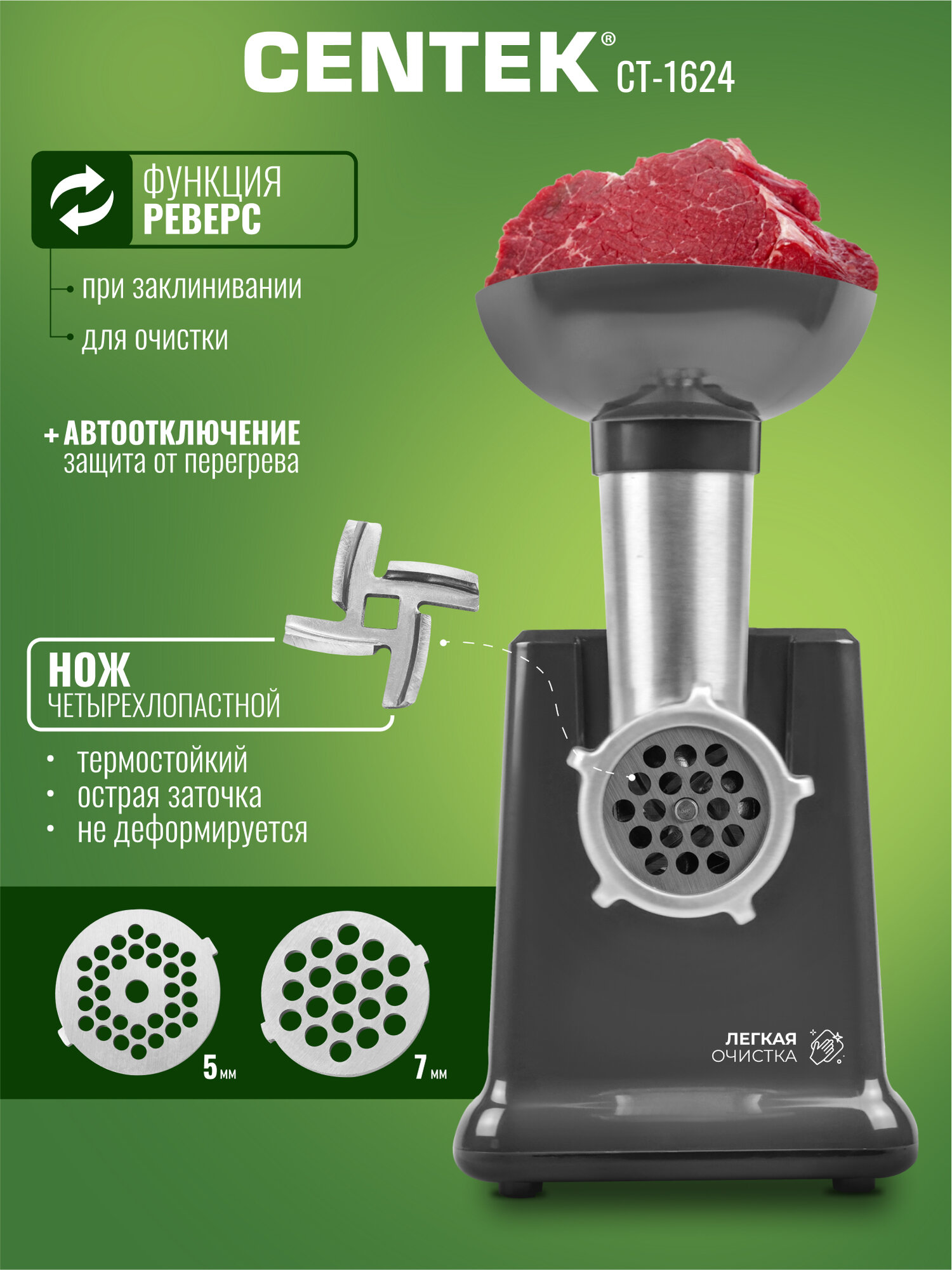 Функция реверса – это еще одно преимущество Centek CT-1624. Она позволяет легко избавиться от застрявших кусков мяса, не разбирая мясорубку. Это экономит ваше время и упрощает процесс приготовления.