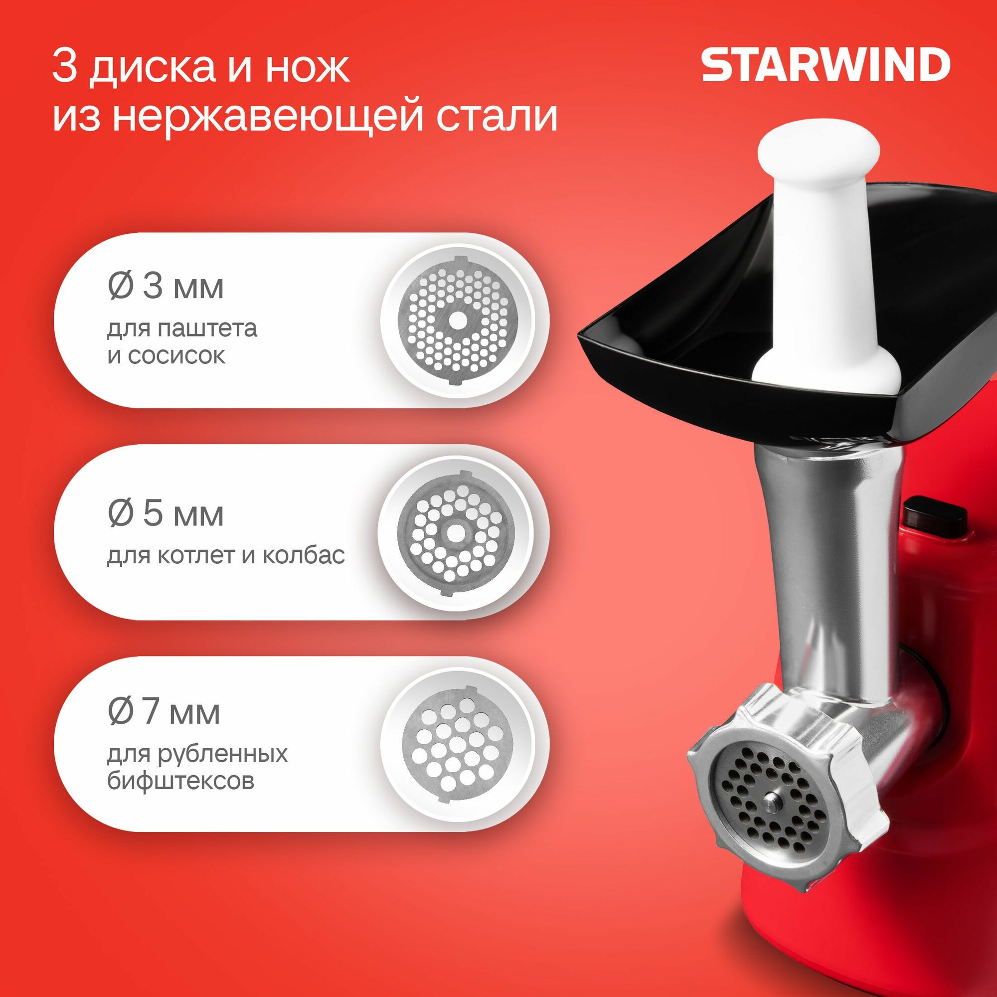Представляем вам мощную и стильную мясорубку Starwind SMG3225 в ярком красном корпусе. Этот незаменимый прибор станет вашим верным помощником в приготовлении вкусных и полезных блюд из мяса, птицы и других продуктов.