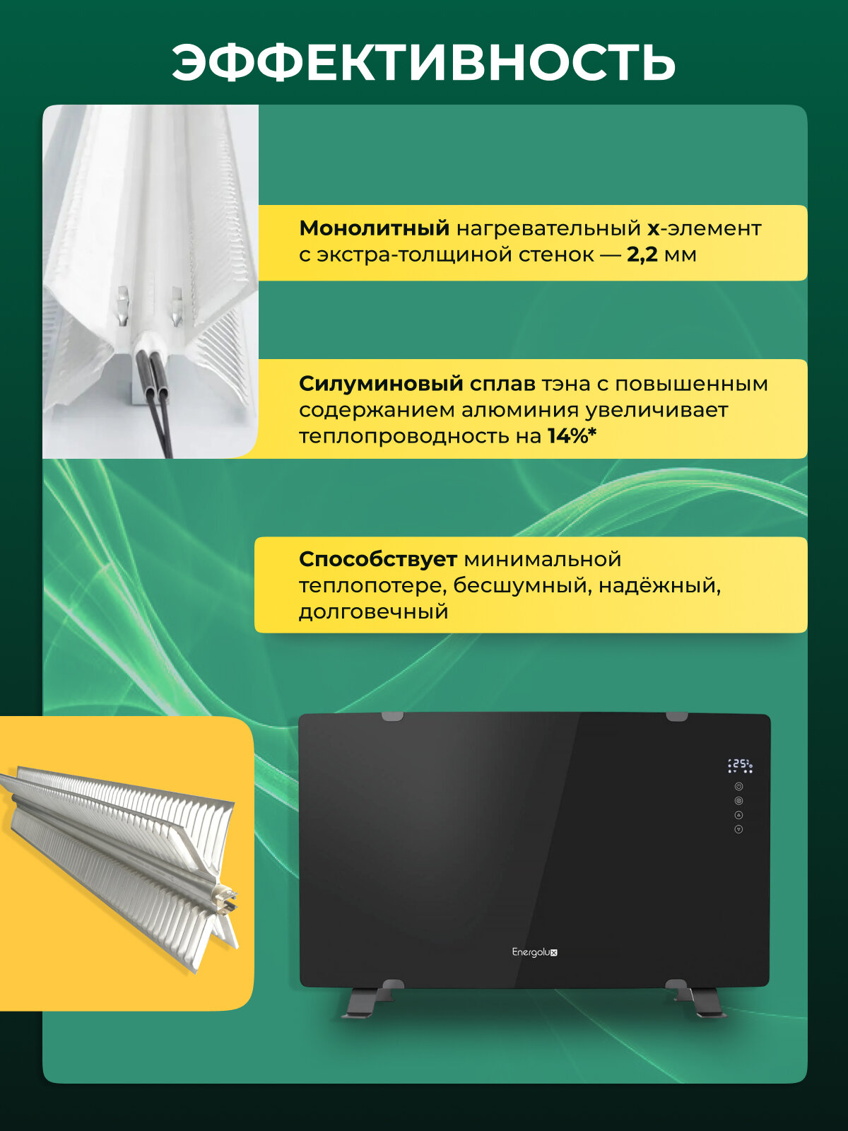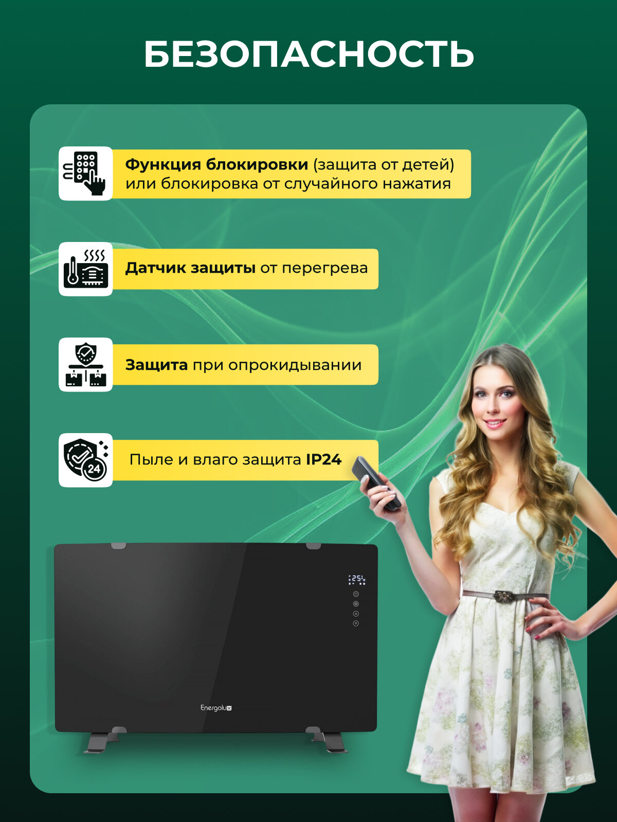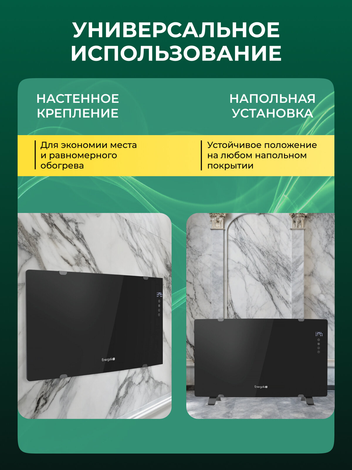 Стильный дизайн с использованием черного стекла придает обогревателю изысканный вид, который гармонично впишется в любой интерьер. Он станет не только источником тепла, но и настоящим украшением вашего дома.