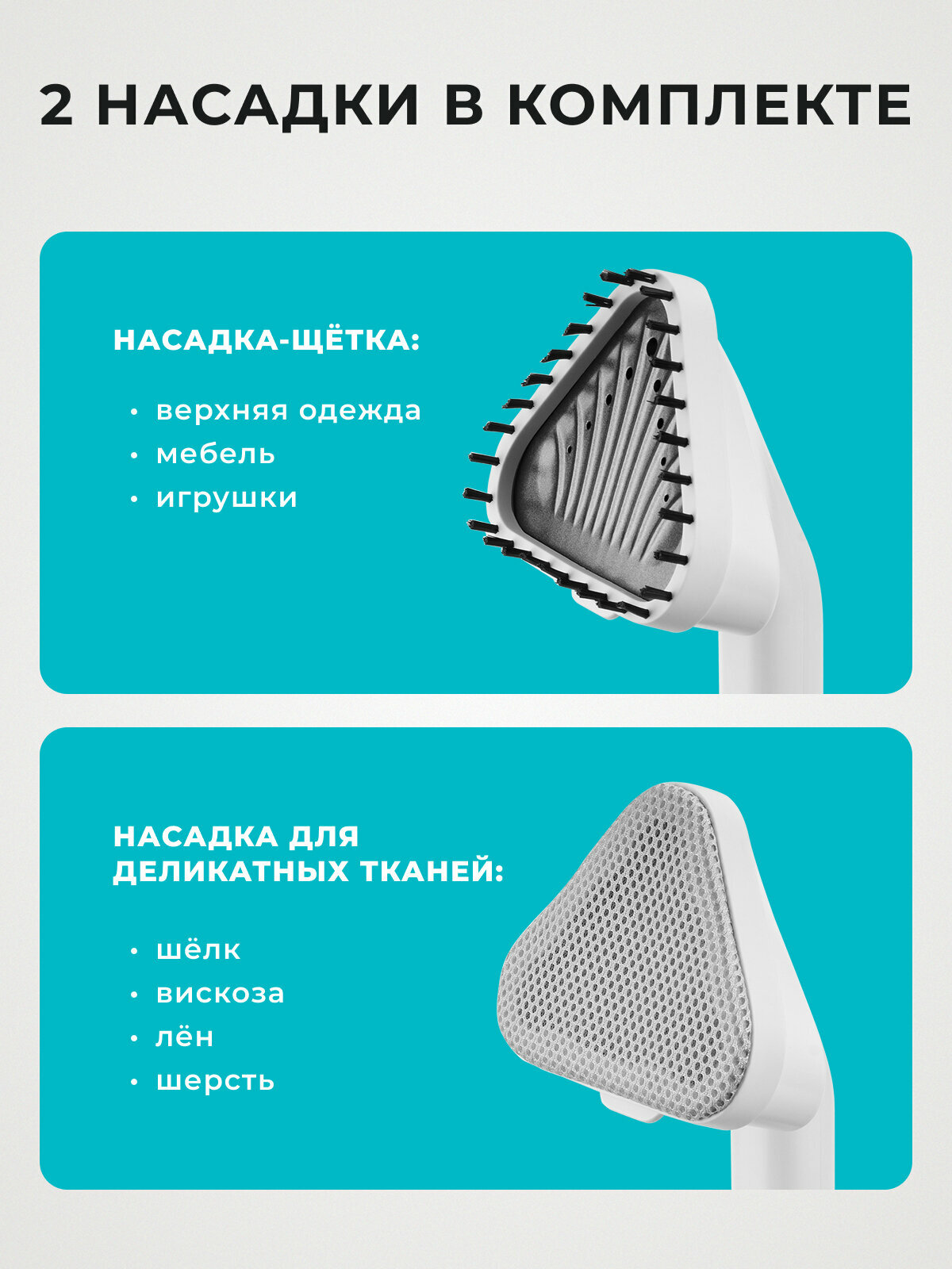 В комплекте с отпаривателем Galaxy Line GL6287 идут специальные насадки, предназначенные для бережной работы с самыми требовательными тканями. Они обеспечивают равномерное распределение пара и предотвращают появление блеска на темной одежде. Это особенно важно для ухода за деликатными вещами, такими как шерсть, кашемир и другие.