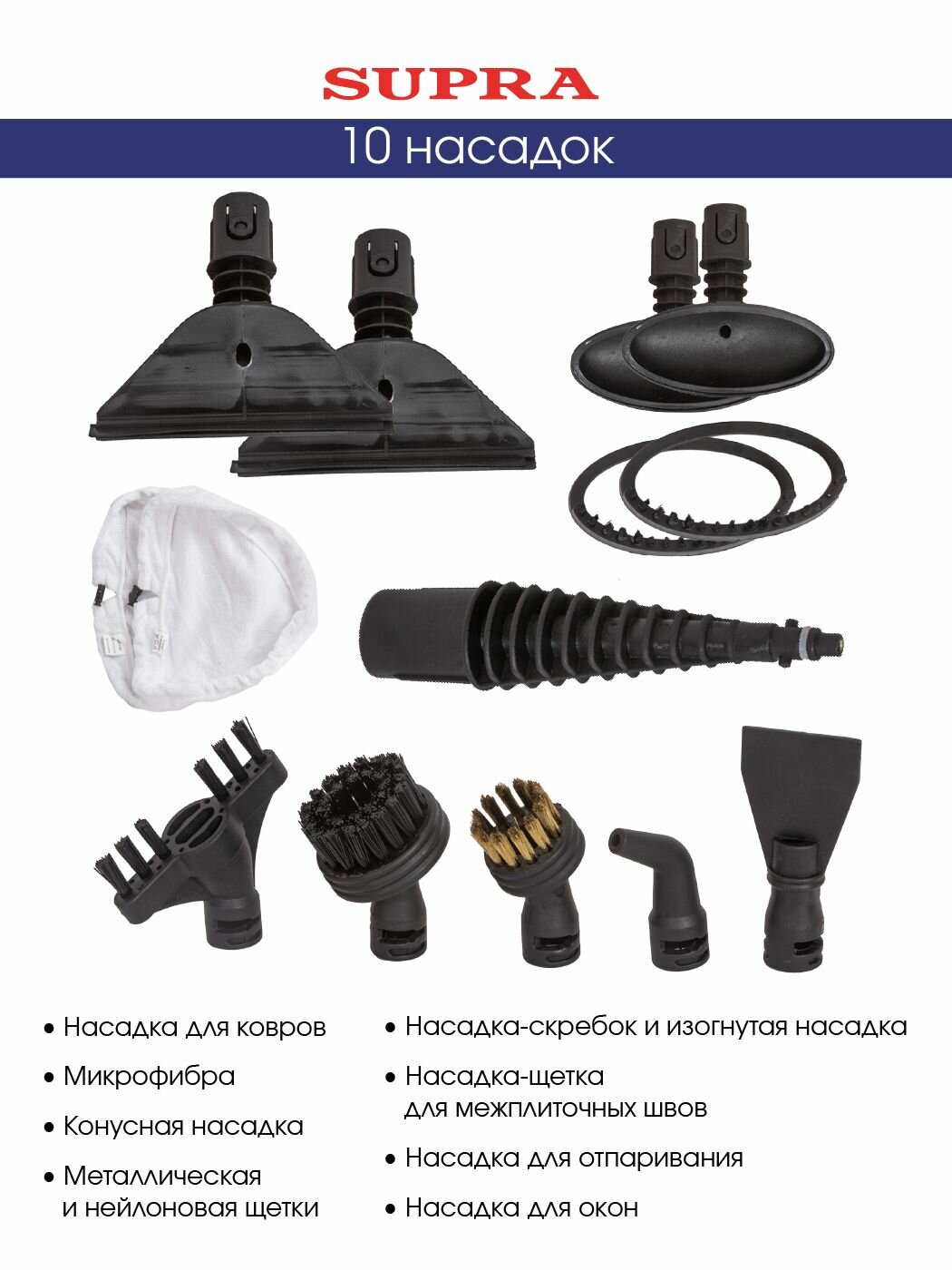 В комплекте с паровой шваброй Supra SMS-305 вы найдете целых 10 различных насадок, предназначенных для решения самых разнообразных задач. Благодаря этому вы сможете легко очистить не только пол, но и ковры, окна, зеркала, мягкую мебель и даже кухонную технику. Каждая насадка разработана для максимальной эффективности и бережного отношения к различным типам поверхностей.